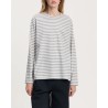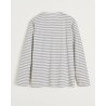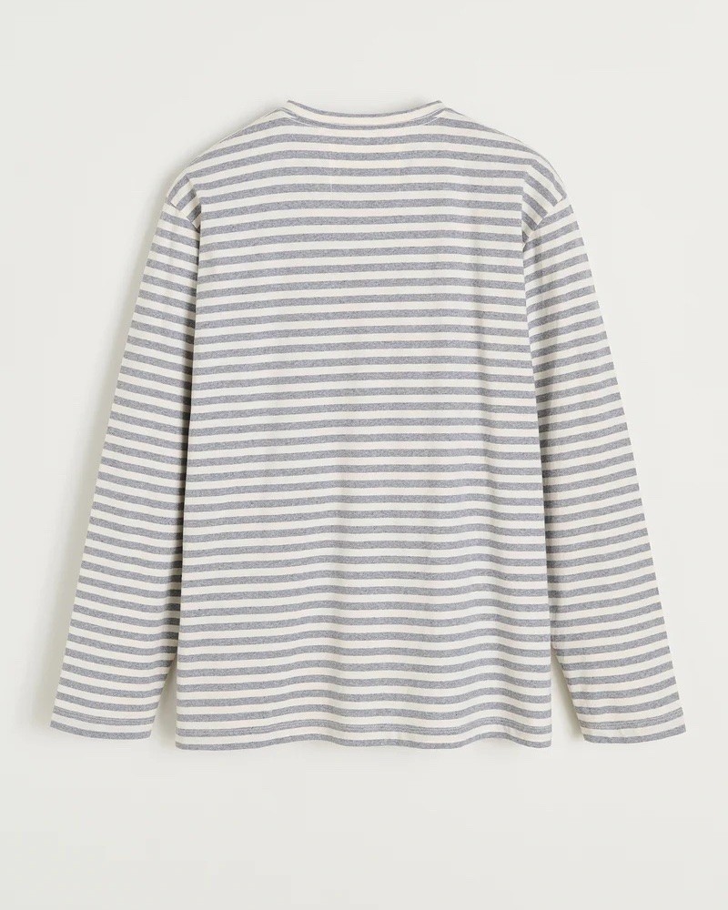 Langærmet klassisk grå melange og ecru stribet t-shirt fremstillet i en blød blanding af genanvendt og økologisk bomuldsjersey. Circular tee er designet med en afslappet og regulær silhuet med rund hals, sænkede skuldre og brystlomme. Med unik kontrast signatursting på siden.