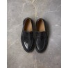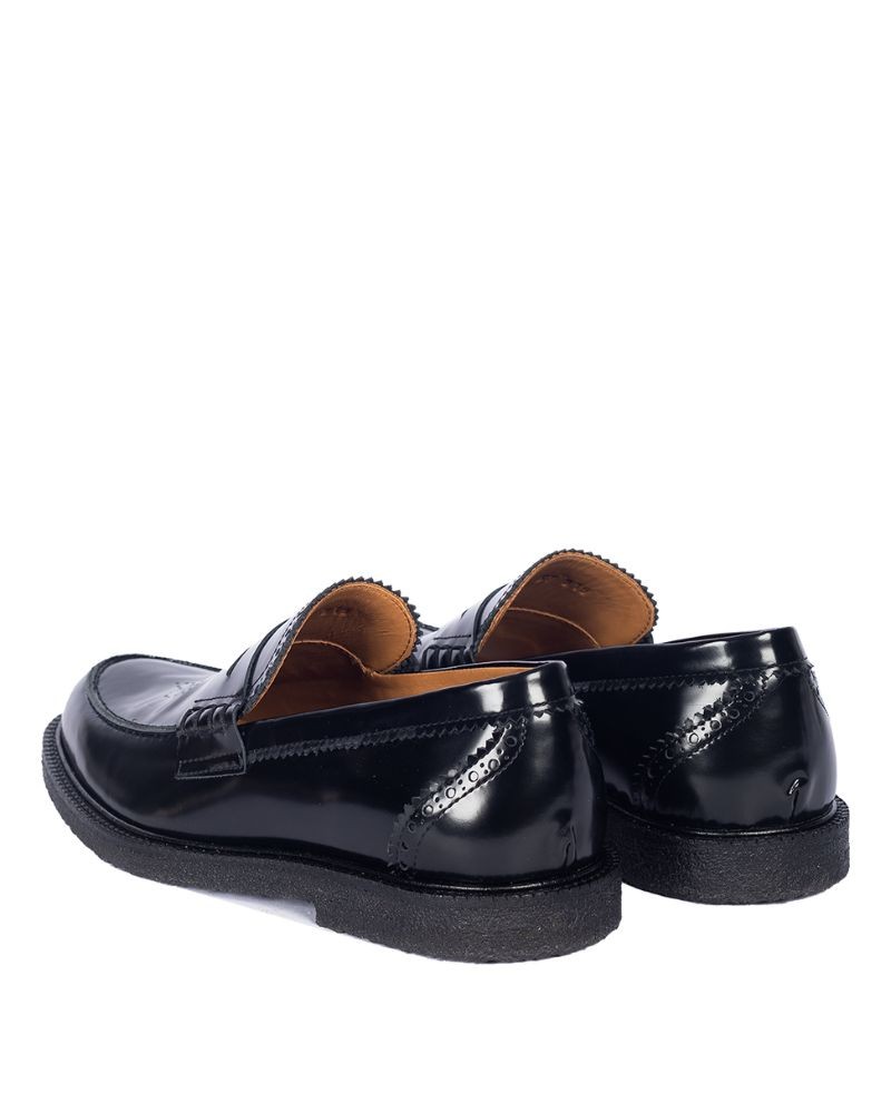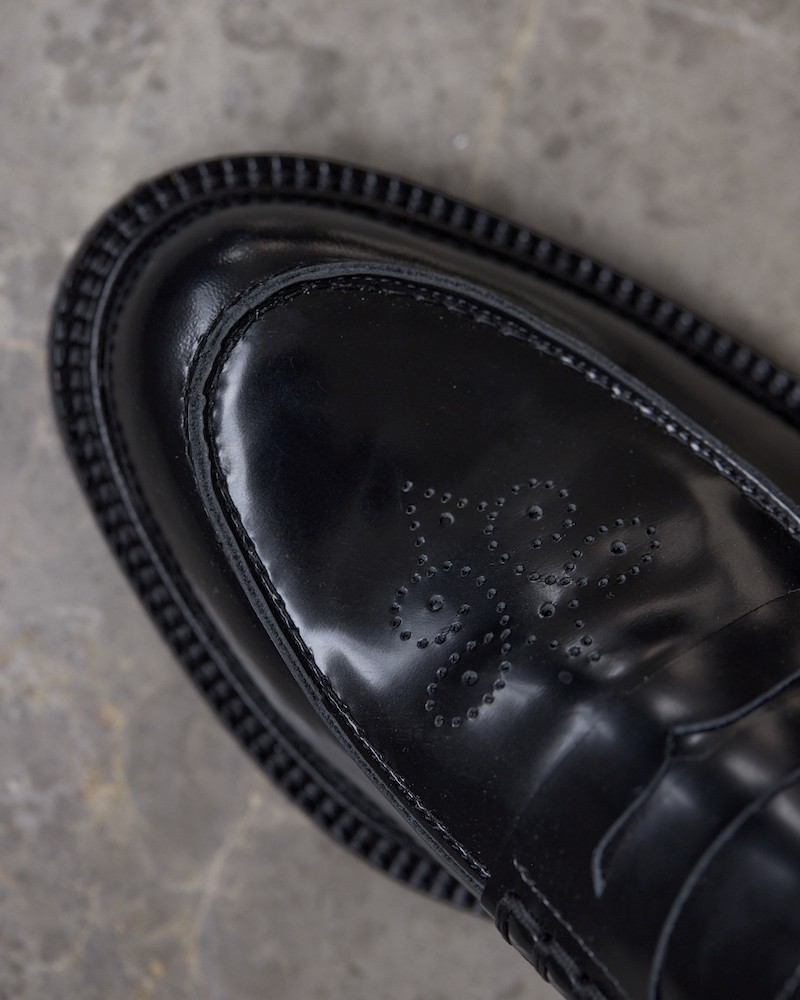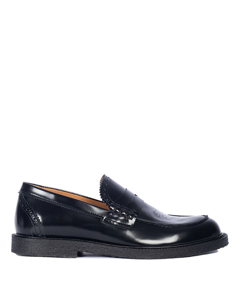 Klassisk Penny Loafer i sort skind med dekorativt brogue hulmønster. Loaferen har mandelformet snude, polstret læderindersål, kromfrit læderfor og fast hælkappe. Med dekorativ sort rand og blød, fleksibel sort gummisål. Designet i Danmark og håndlavet i Portugal.