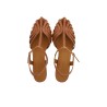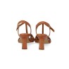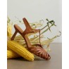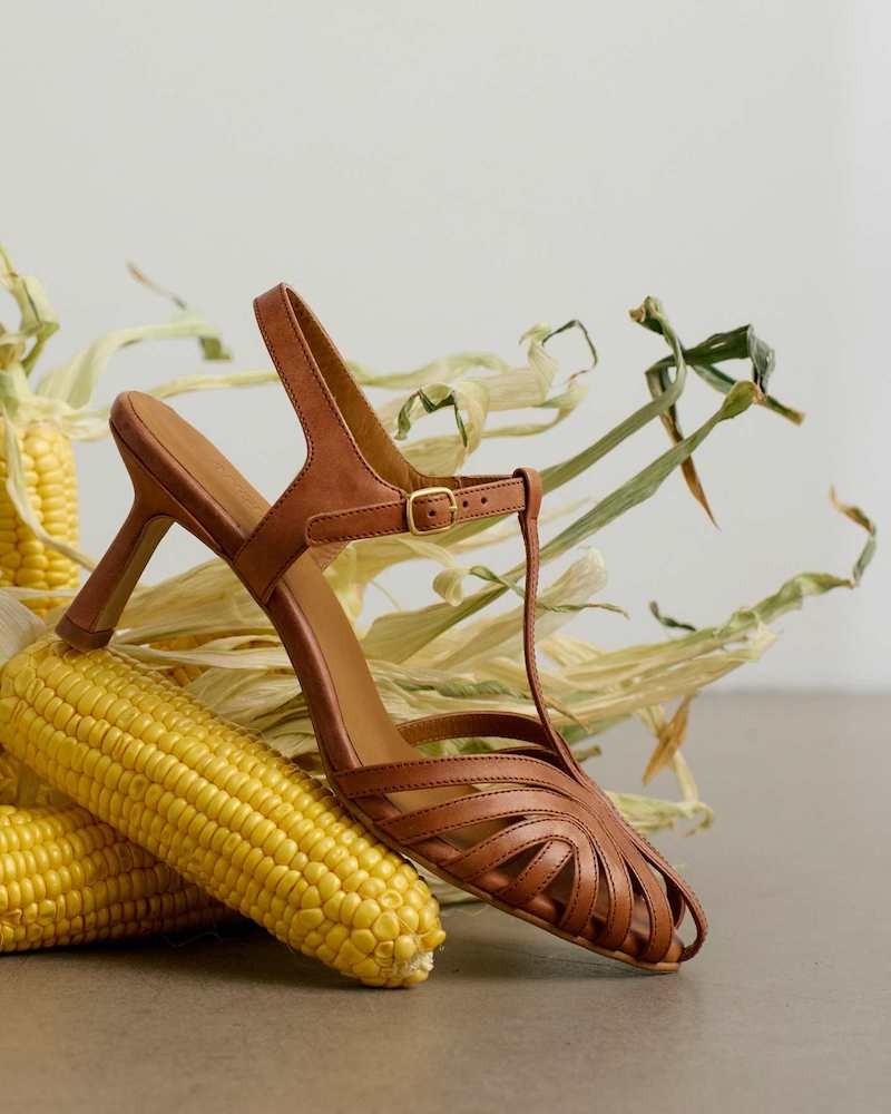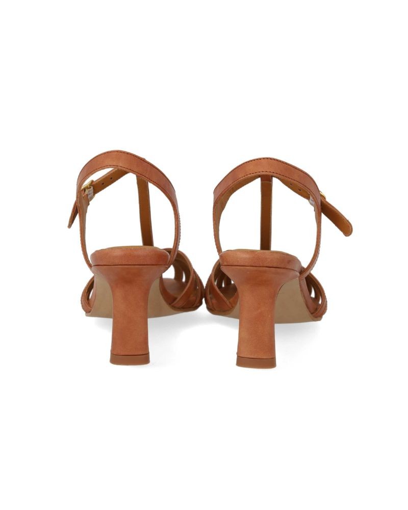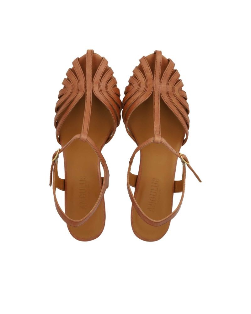 Højhælede cognac sandaler med smukke organiske detaljer. Sandalen har en T-rem med justerbar spændelukning med smalle feminine remme, som holder foden på plads. De har polstret indersål, kromfrit læderfor og har en let tunit sål med e 6 cm buet hæl. Fremstillet i naturligt og åndbart læder. Designet i Danmark og håndlavet i Portugal.