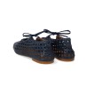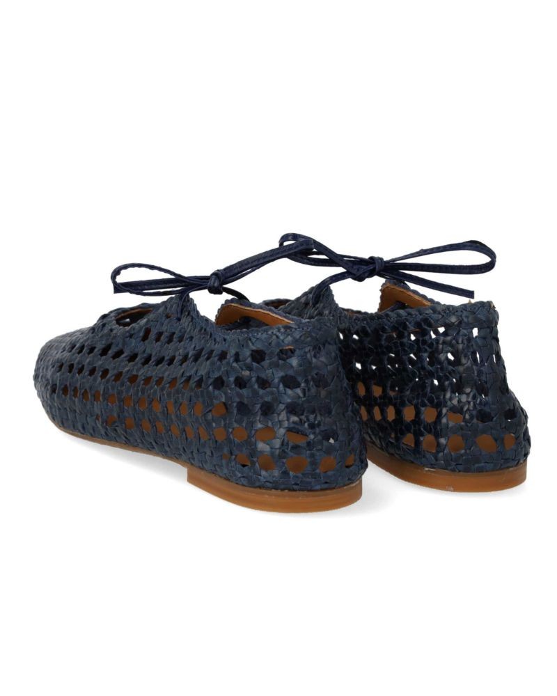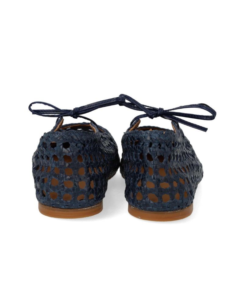 Blød navy ballerina i håndflettet læder med justerbar sløjfedetalje. Ballerinaen har firkantet snude, blød hælkappe, vatteret indersål, kromfrit læderfoer og en let, blød og fleksibel gummisål. Den øverste del af skoen er udformet i naturligt vegetabilsk garvet læder og er håndvævet i Indien, hvilket gør hvert par unik. Farve og mønstre kan variere. Bør behandles med omhu. Udformet i naturligt og åndbart skind, designet i Danmark og håndlavet i Portugal.