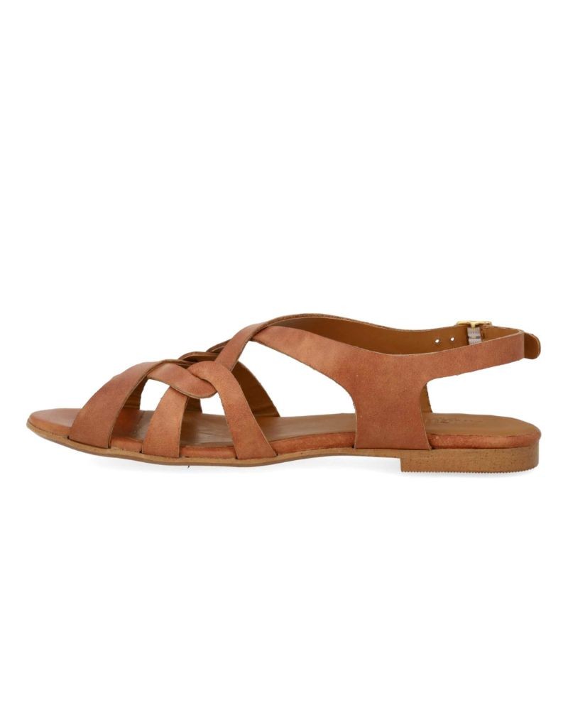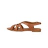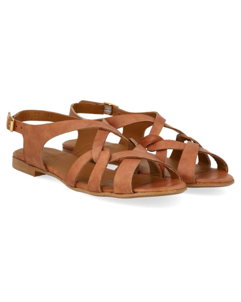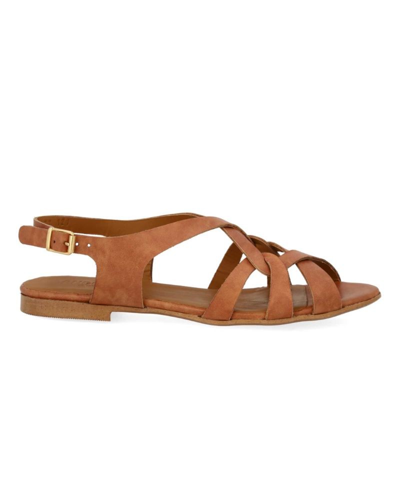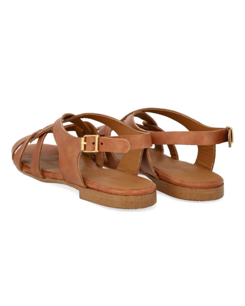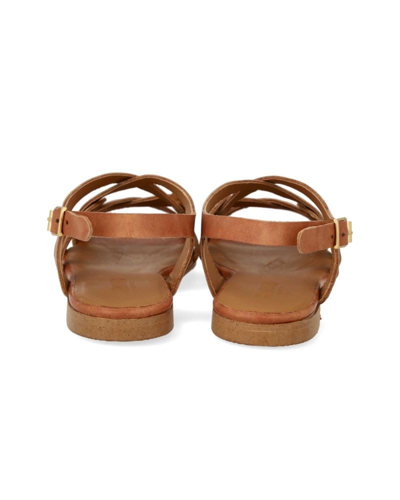Let lædersandal i cognac med fine remdetaljer. Sandalen har rund åben tå, polstret indersål og foer i kromfrit læder. Den har justerbar ankelrem med guldfarvet spænde og en let og fleksibel tunitsål. Fremstillet i naturligt og åndbart læder. Designet i Danmark og håndlavet i Portugal.