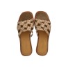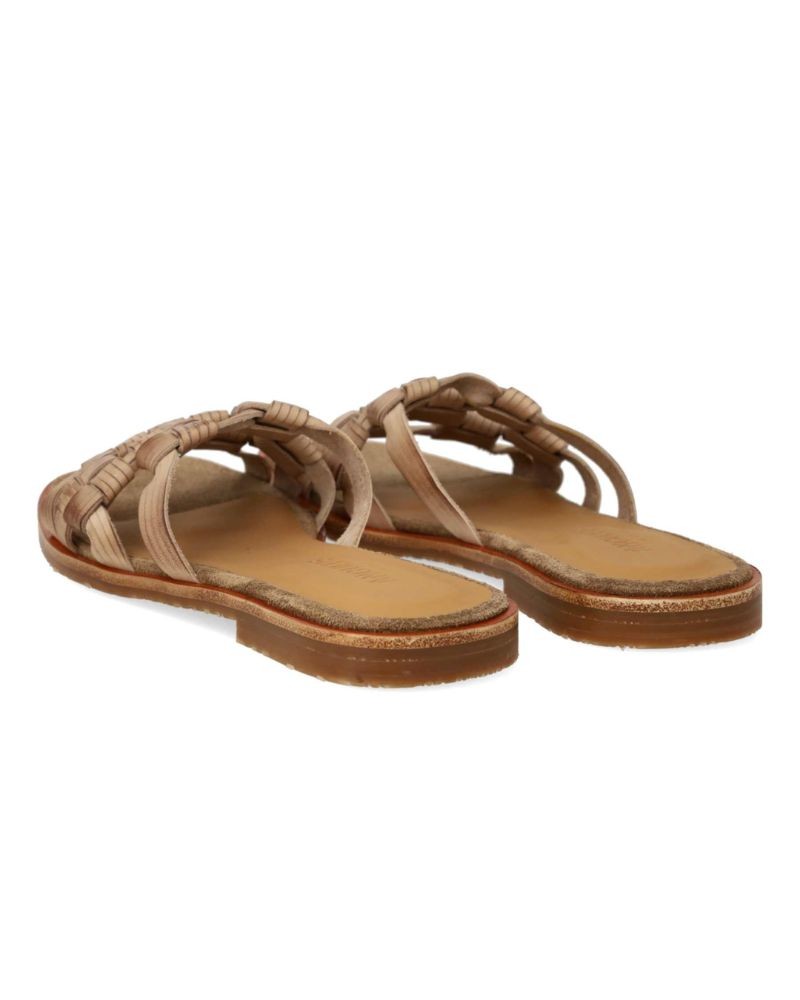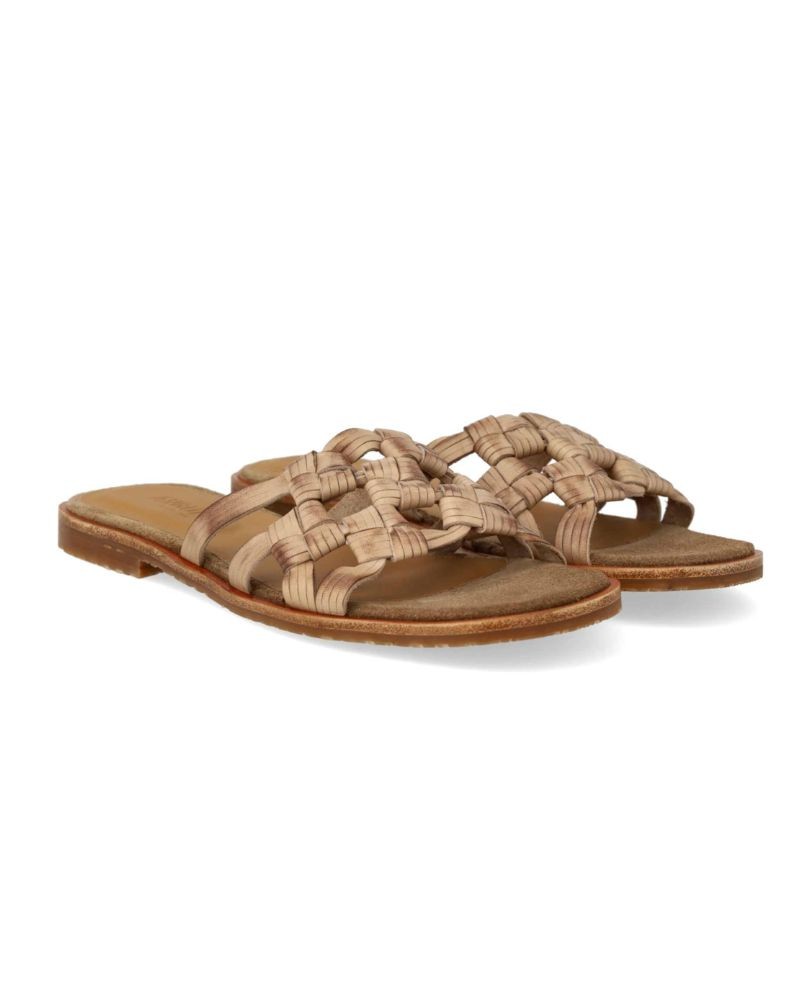 Enkel slip-in sandal i sandfarvet skind med flettet overdel. Sandalen har let kantet snude, polstret indersål i kromfrit læder med blød ruskindskant og en let, blød og fleksibel gummisål. Designet i Danmark og fremstillet i Portugal.