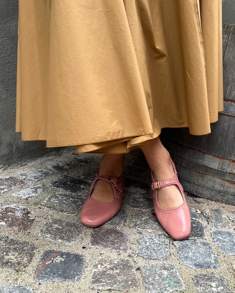 Flad Mary Jane sko i lyserød krøllet lakeret gedeskind. Praise har rund snude, med smal elastisk rem henover forfoden med guldfarvet spænde. Indvendigt er den foret med naturligt og kromfrit læder. Ydersålen er læder, en meget slidstærk og åndbar sål med en behagelig pasform, der former sig efter foden. Fremstillet i Portugal.