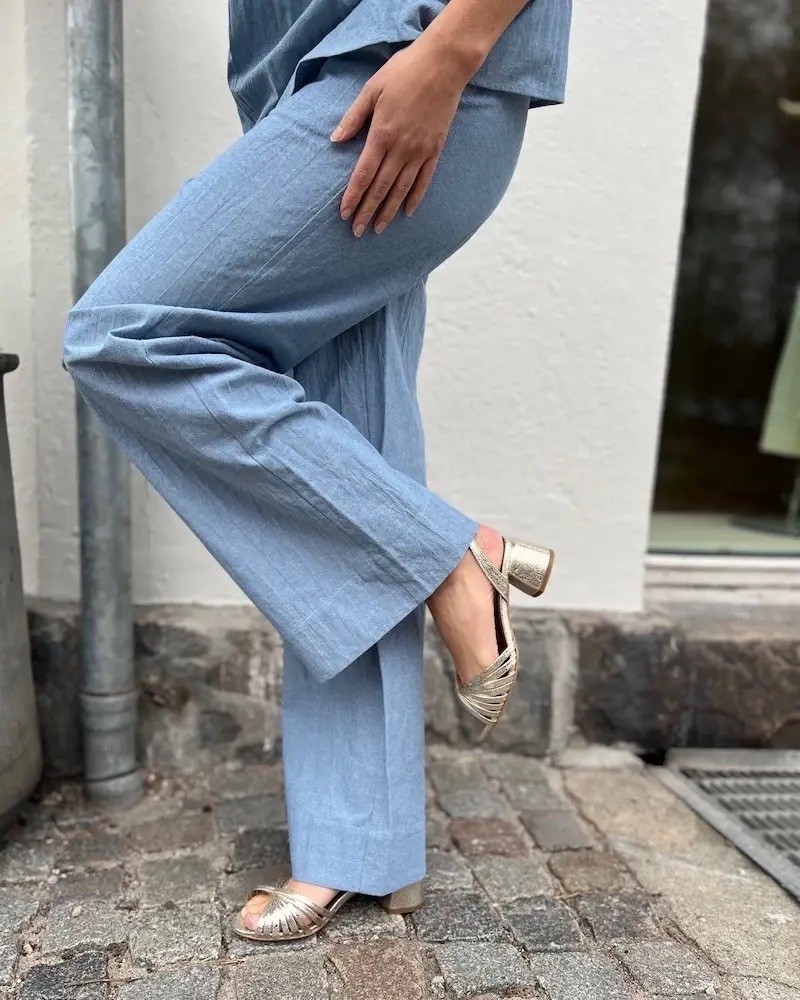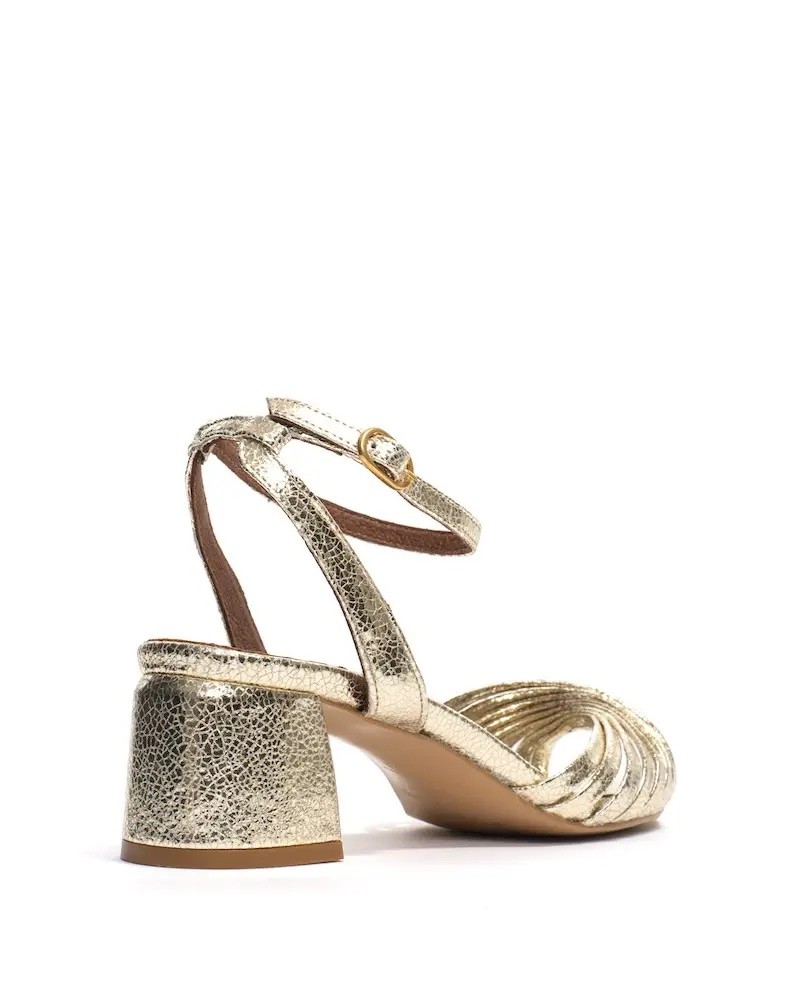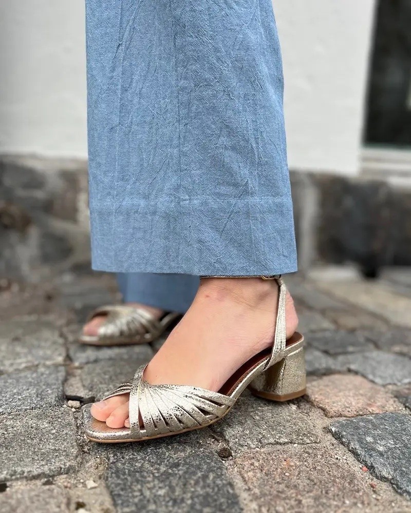 Margriet sandal i crackled metallic champagne lammeskind. Sandalen er designet med open-toe og smalle fine remme henover forfoden og en smal rem bag om hælen med justerbart spænde på siden. På behagelig blokhæl med en højde på 40 mm og med tunit sål.