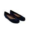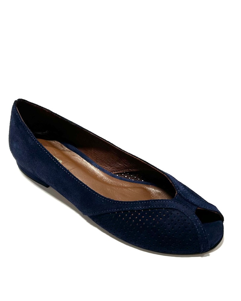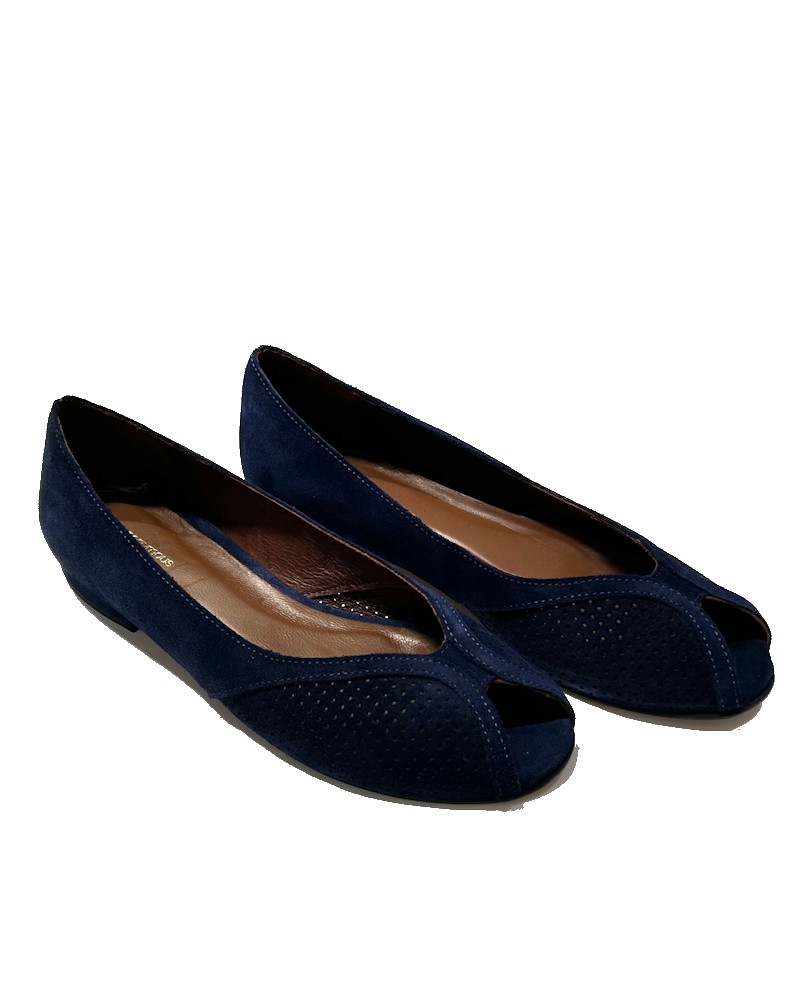 Tiffy open-toe flad sandal i blækblå ruskind med fin prikket struktur. Tiffy er foret indvendigt med kromfrit læder og har en slidstærk sål af tunit, der har høj slidstyrke. De har en lille 20 mm hæl, der giver et lille løft og samtidig bevarer komforten. Fremstillet i Portugal.
