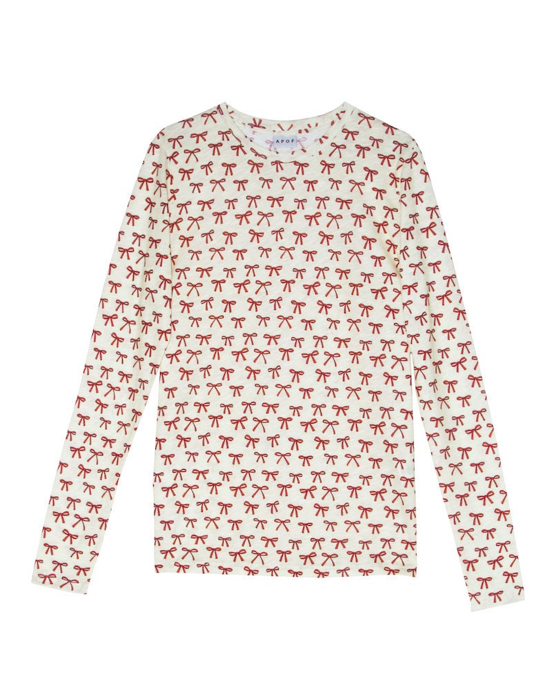 Langærmet t-shirt i blød jersey i ecru ultra blød bomuld med røde sløjfe print. T-shirten har rund hals og lange ærmer, og er i lettere loose fit.