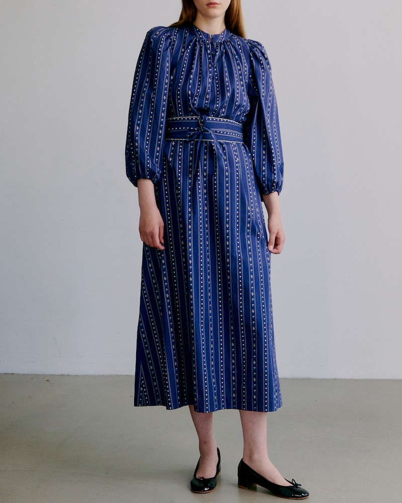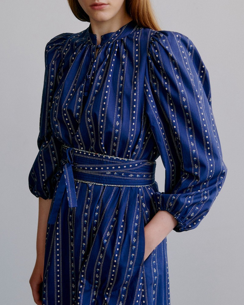 New Maya kjolen er en af de velkendte Apof favoritter, der vender tilbage sæson efter sæson - denne gang i det smukke belle blue print. Den luftige silhuet, bindebæltet og de brede ærmer skabet et klædeligt udtryk. Med pufærmer, knapper foran ned til brystet og trekvarte ærmer med elastik i kanten. Brug den med eller uden bæltet som medfølger løst.