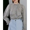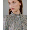 Annabella tunika skjorte i liberty printet emilia flower, khaki, aqua og gylden blomstret, blødt bomuldsstof. En feminin skjorte med flæsekrave, rynkede skuldre og betrukne knapper foran ned halvvejs. Annabella har en afslappet pasform med lange ærmer med flæsemanchet og elastik. De feminine afrundede kanter for neden, gør den nem at style både løsthængende og indstukket i bukser eller nederdel.