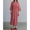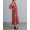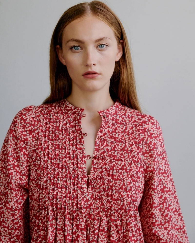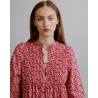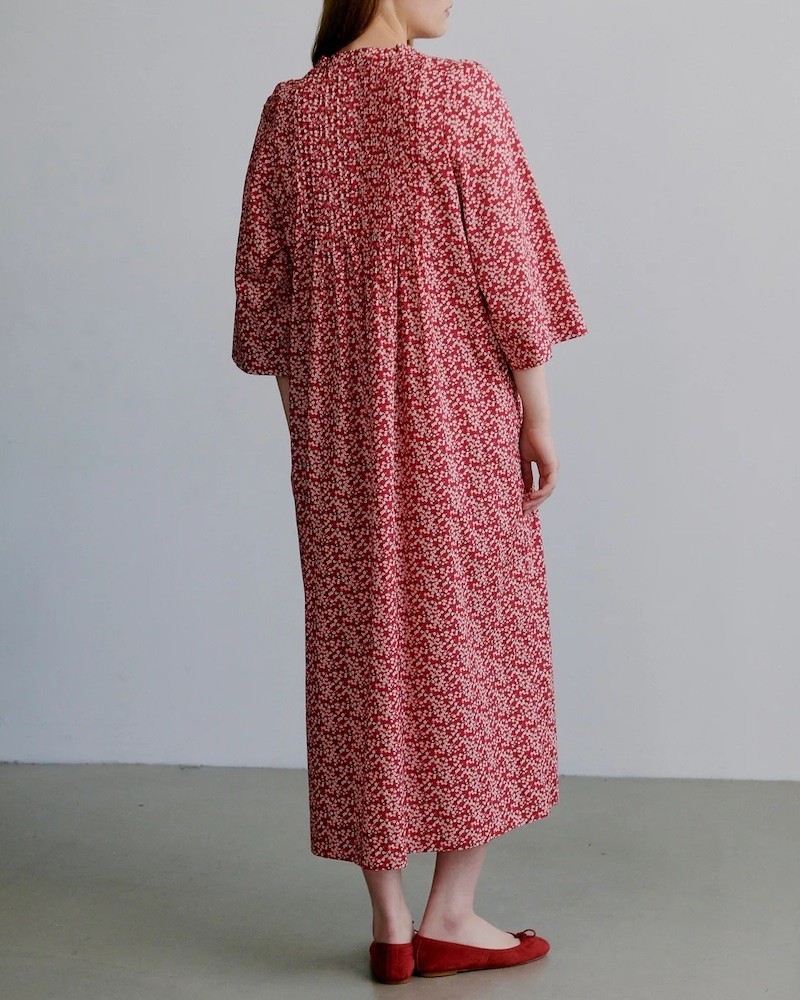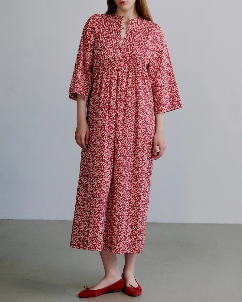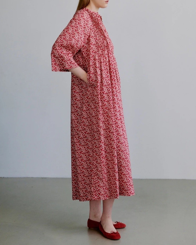 Ingrid kjole i liberty printet mitsi valeria, rød og hvid blomstret, blødt bomuldsstof. Kjolen har en let, feminin silhuet med fine rynk på bærestykket, rund halsudskæring og knapper foran ned til brystet. Den har lommer i siderne, og et elegant, naturligt fald.