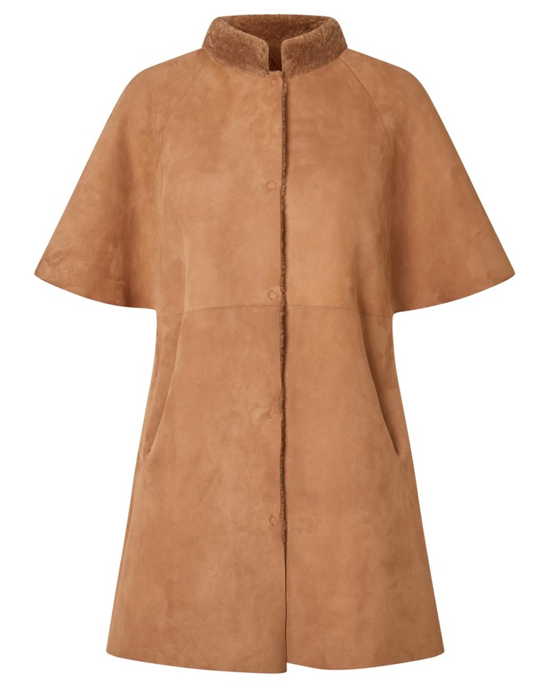 Adeline vendbar vest i lækker, blød og curly cognac brun rulam. Vesten har kinakrave, korte ærmer og er i et afslappet fit. Den er en anelse smallere for oven, og har en elegant og fin a-facon. Den har lommer i siderne, og lukkes med trykknapper.