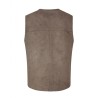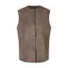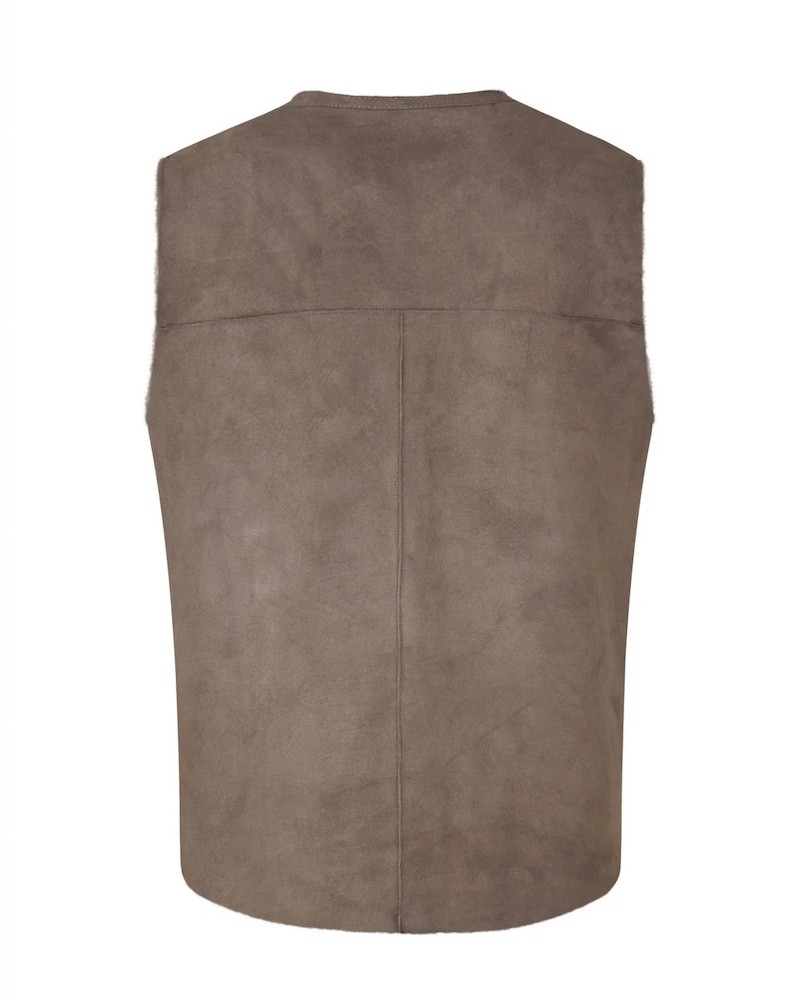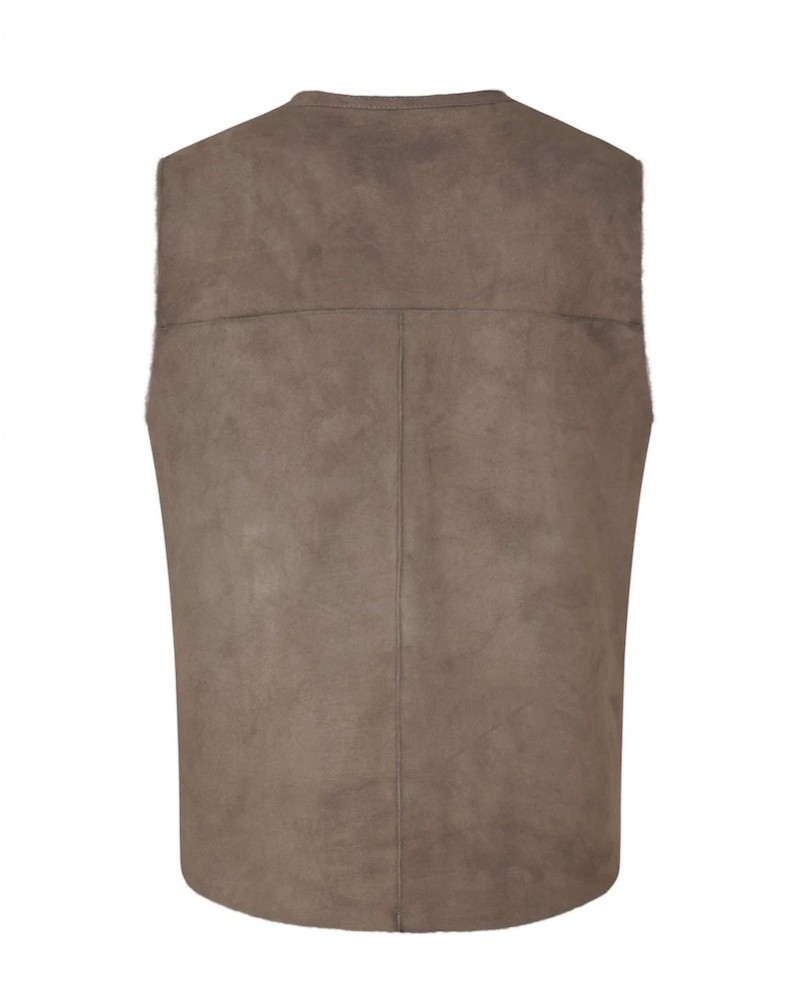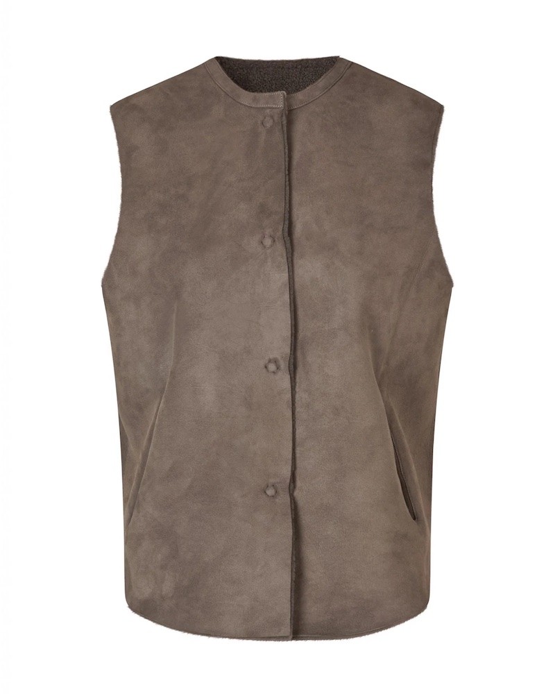 Vendbar taupe vest i blød lammeskinds rulam. Vesten har rund halsudskæring, og et lige og let fitted snit med et dybt ærmegab. Så der nemt er plads til en strik eller let jakke under. Den har et enkelt og minimalistisk udtryk, lukkes med trykknapper og har en lille skrålomme i hver side.