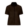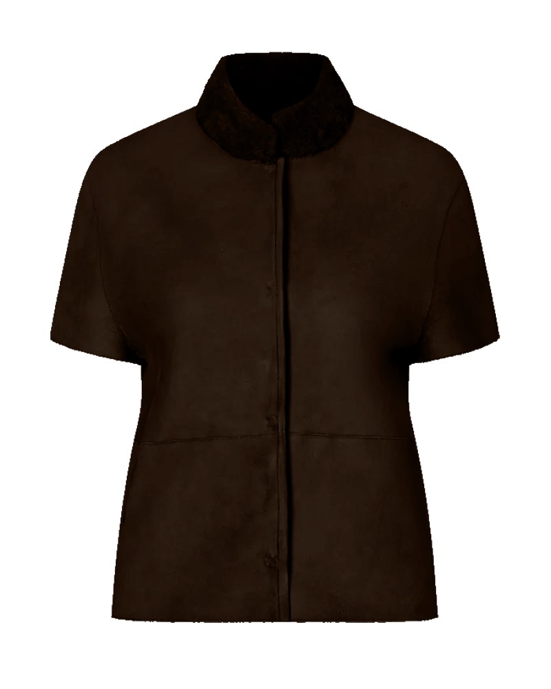Elegant vendbar mørkebrun pelsjakke i blød lammeskinds rulam. Jakken har lille krave, og helt korte ærmer der kombinerer tidløst design med luksuriøs funktionalitet. Den går til midt på hoften og lukkes med diskrete trykknapper. Når pelssiden vendes udad, fremhæves den fine ruskindskant langs trykknapperne, som giver den et elegant og eksklusivt præg. De praktiske skrålommer understøtter det afslappede og sofistikerede design.
