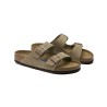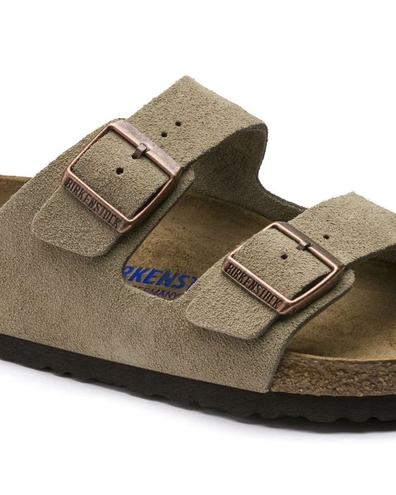 Arizona sandal i taupe ruskind med blød fodseng med to remme med justerbare metal spænder. Arizona har blød indlægssål med integreret gummi-skumpude, hvilket gør den ekstra blød og behagelig.