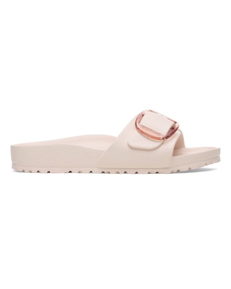 Madrid sandal i lyserød plastmateriale (EVA) designet med det store big buckle Birkenstock logo spænde. Materialet EVA er høj kvalitet, lugtneutralt og testet for skadelige stoffer. Det er ultralet, meget elastisk, vandtæt og hudvenligt. De perfekte sandaler til stranden, ferien og hjemme.