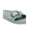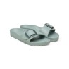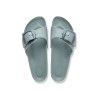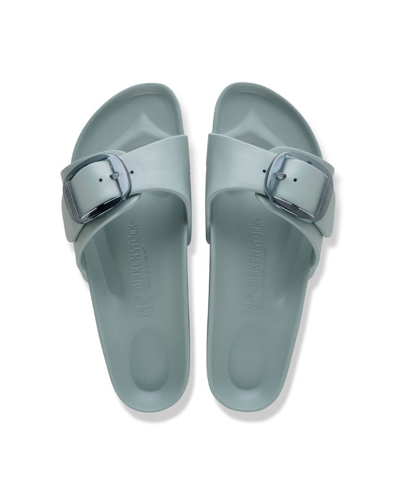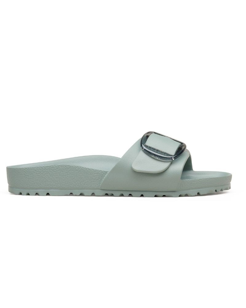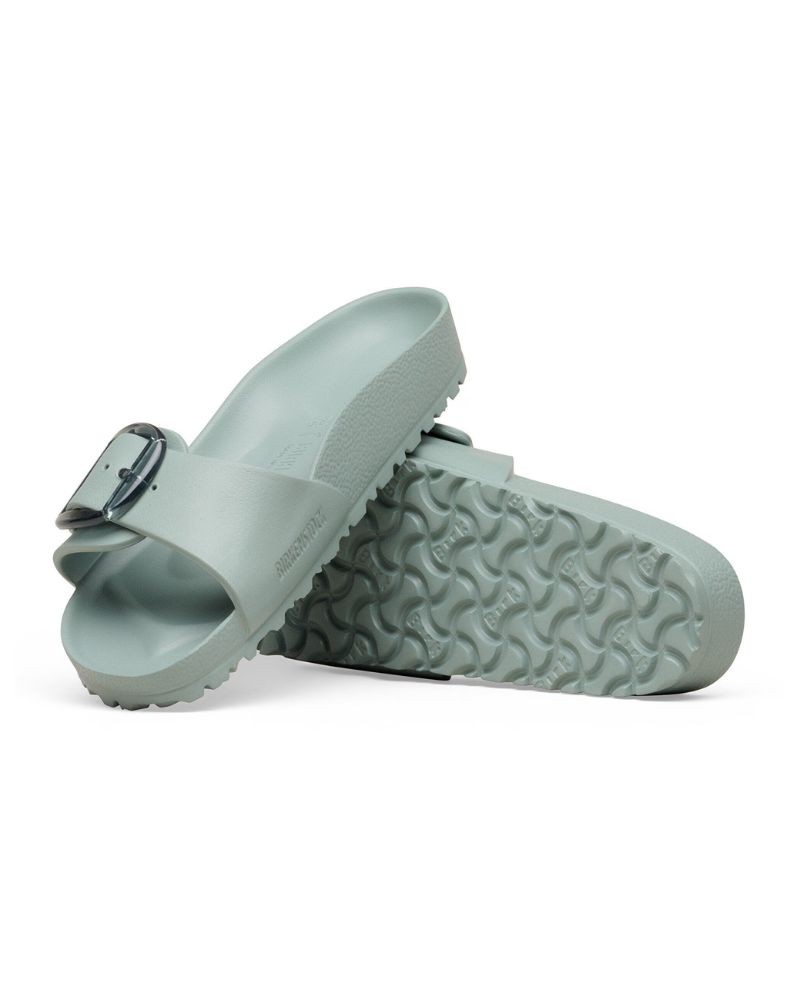 Madrid sandal i lysegrøn plastmateriale (EVA) designet med det store big buckle Birkenstock logo spænde. Materialet EVA er høj kvalitet, lugtneutralt og testet for skadelige stoffer. Det er ultralet, meget elastisk, vandtæt og hudvenligt. De perfekte sandaler til stranden, ferien og hjemme.