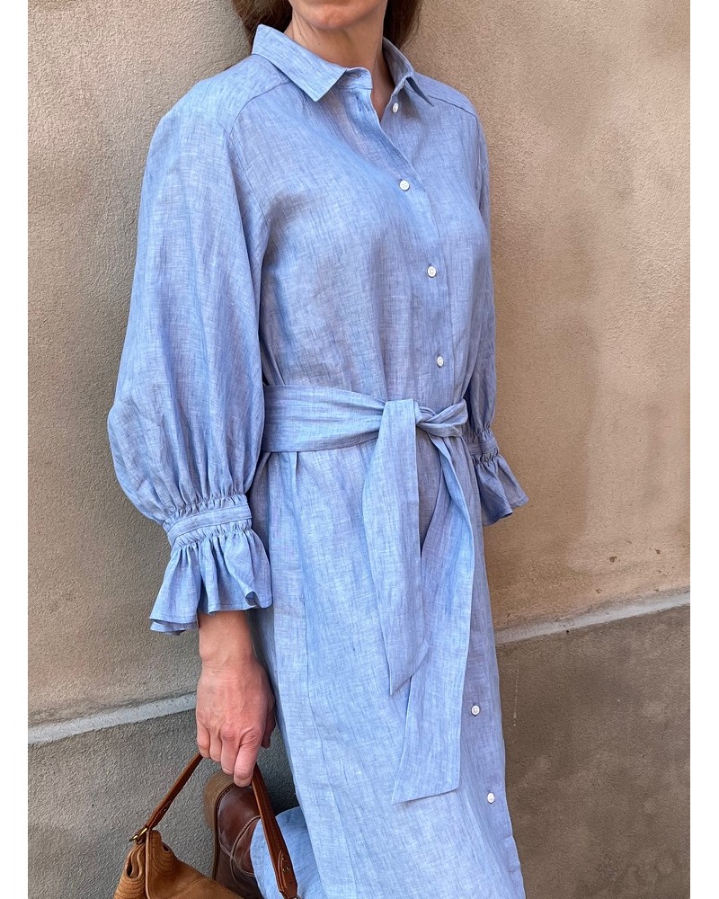 Beel kjole fremstillet i lyseblå ren og åndbar hør. Kjolen har skjorte krave, er gennemknappet og har et løst bindebånd i taljen. Med smukke, elegante lange ærmer med vidde og flæser med bindebånd ved håndleddet. Den er designet til komfort og bevægelse, og falder ubesværet på kroppen. Med feminine læg på ryggen, som giver den et elegant og naturligt fald.