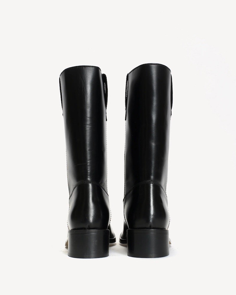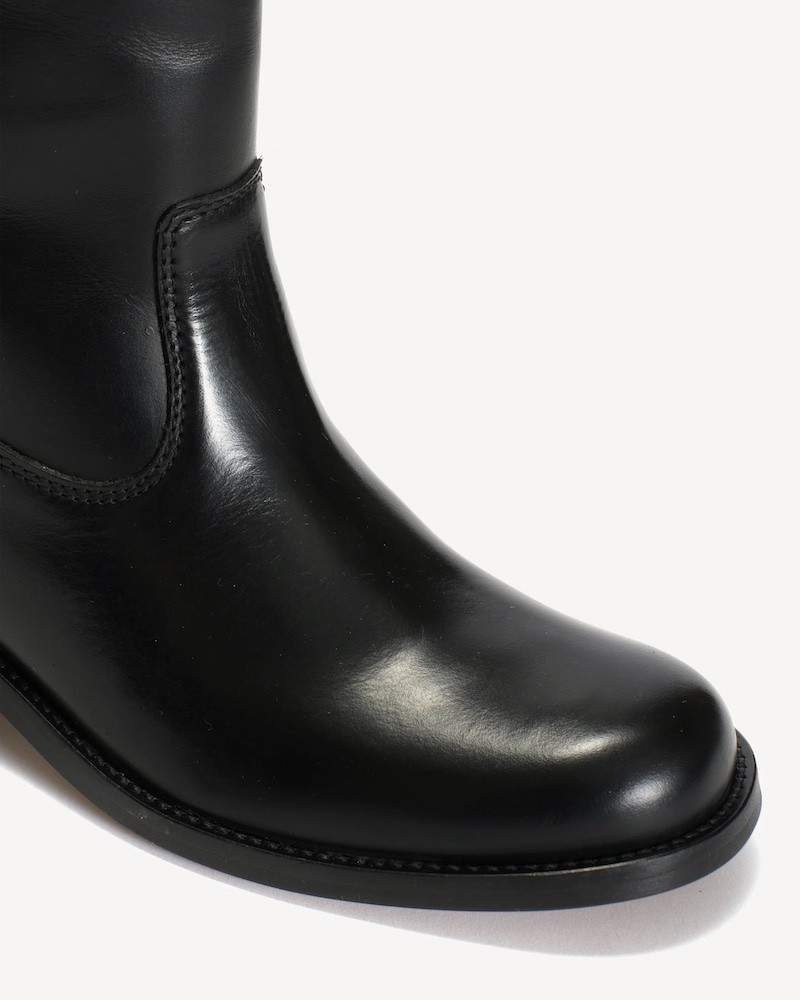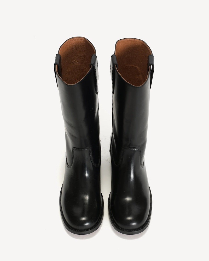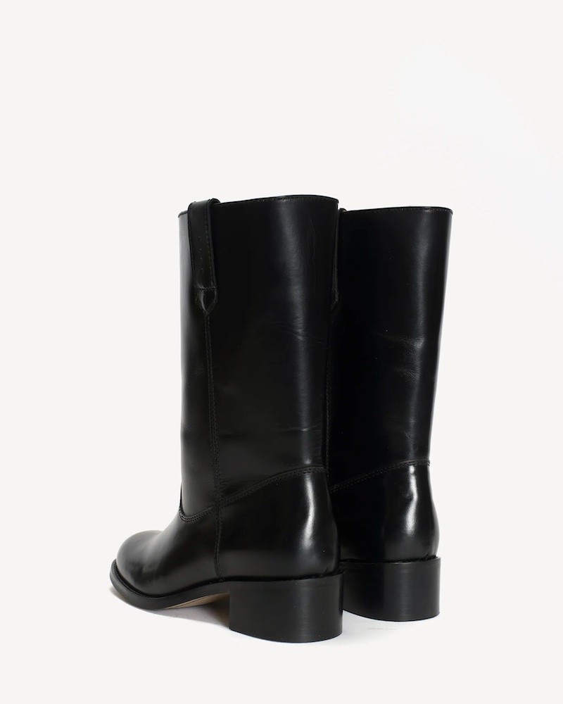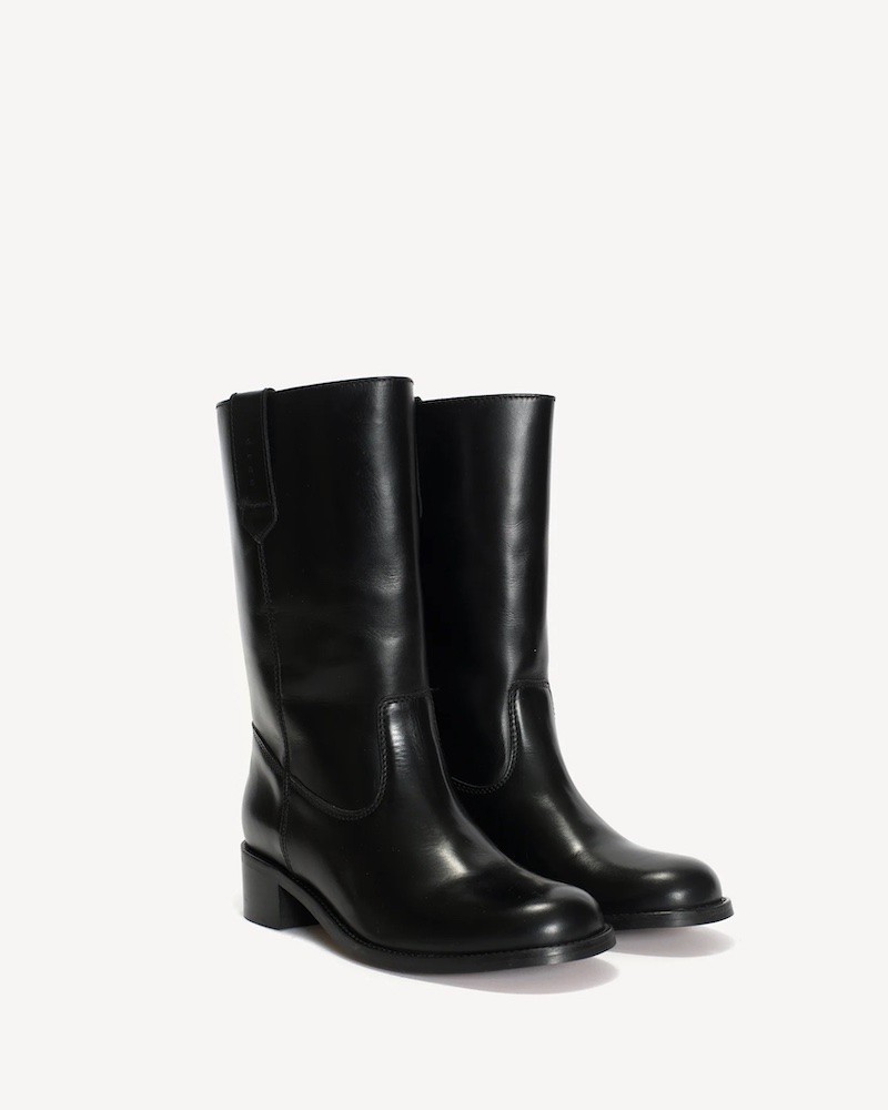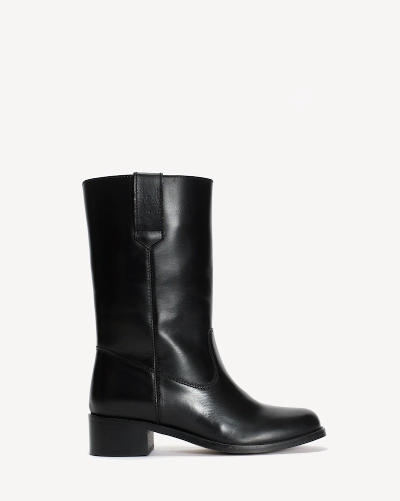 Julia Gaucho støvlerne er en af Dico Copenhagens mest ikoniske støvler, denne i "Texas Black" helt sort og glat skind. Støvlerne er designet i en klassisk og mellemhøj silhuet med rundet snude og lille blokhæl, og med sort sål. Lavet i Portugal.