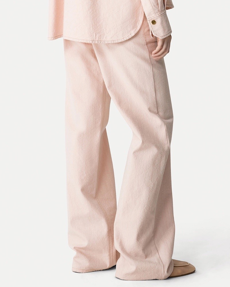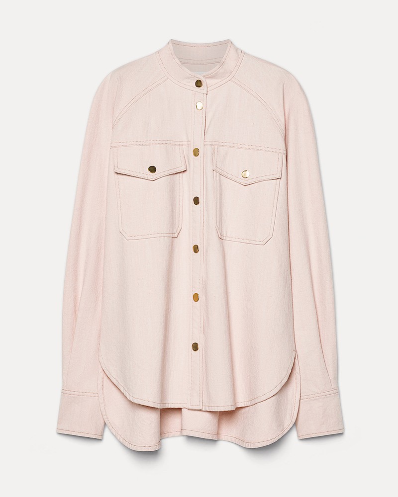 Feminin og afslappet denim skjorte i Peonia lyserød bomuld med let struktur. Skjorten har mandarinkrave, to klaplommer foran på brystet og er gennemknappet med elegante gyldne knapper. Den har en afslappet pasform, med afrundede kanter for neden, kontrast syninger og gyldne knapper på manchetterne.