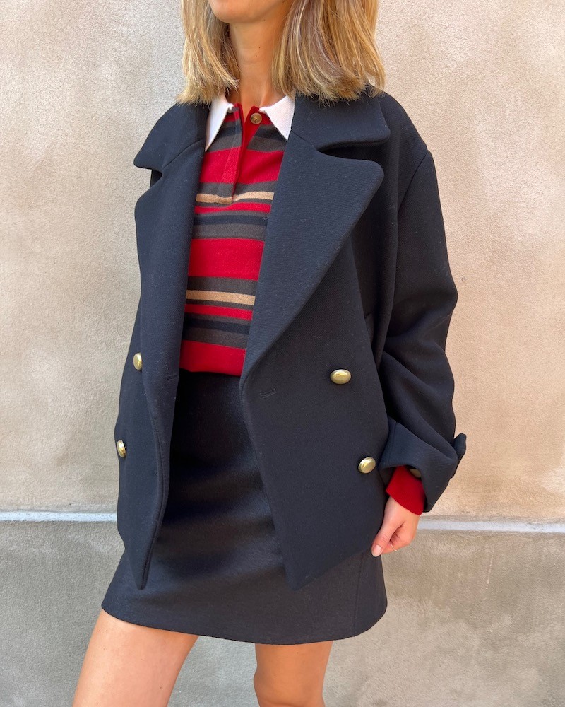Klassisk dobbeltradet peacoat i sort uldblanding.