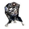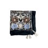 Mønstret silketørklæde i hvid, mørkebrun og blå farver. Tørklædet er kvadratisk med små dekorative pomponer.