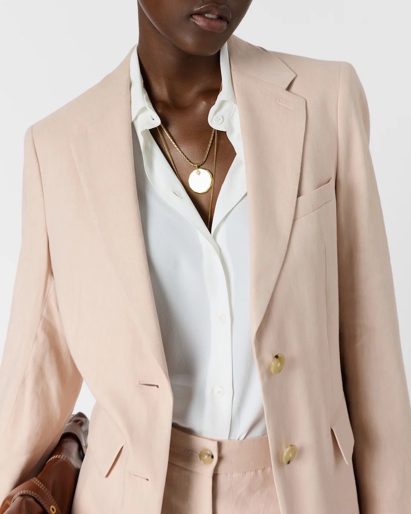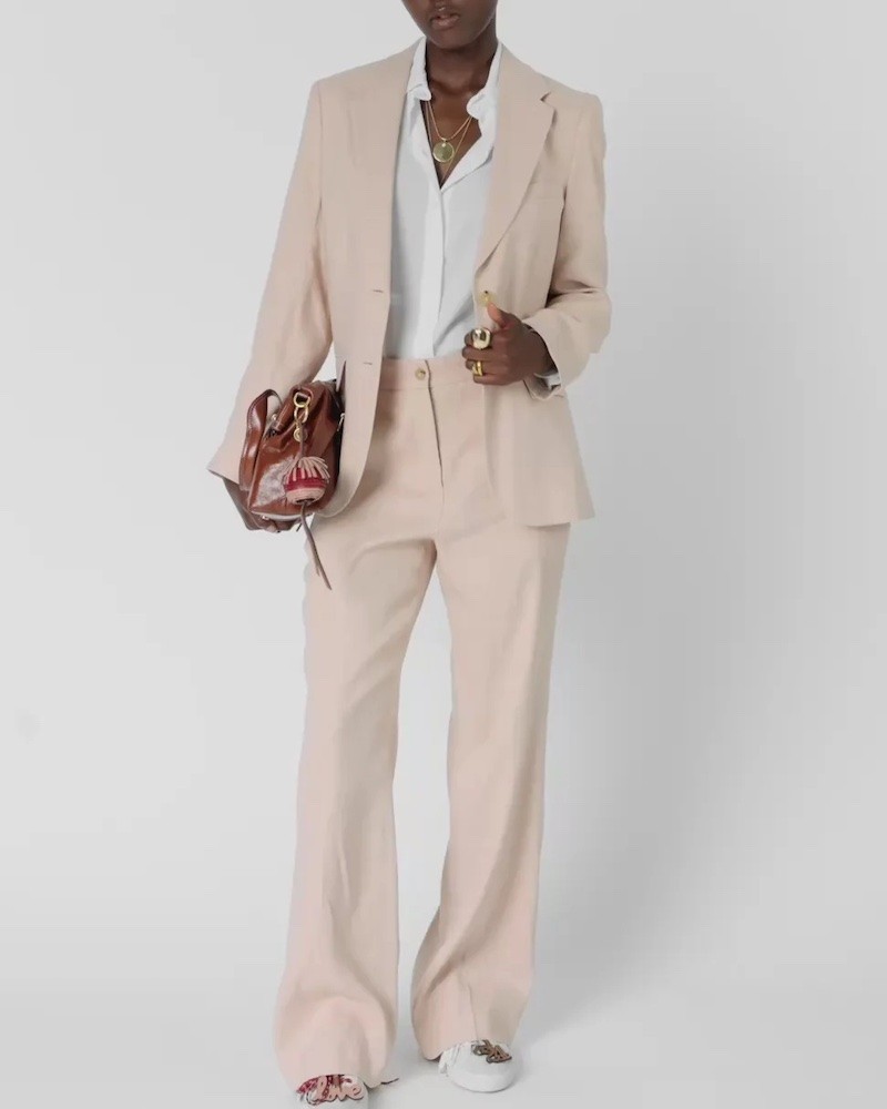 Tazia enkeltradet blazer jakke fremstillet i blanding, der primært består af hør, i smuk pudderfarvet nude nuance. Jakken har en tætsiddende pasform og et lige snit. Den har klassisk hak-revers, lukkes med to knapper og har to lommer med klap samt en paspoleret brystlomme. Med slids midt bag for ekstra komfort og bevægelse.