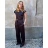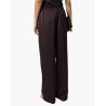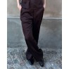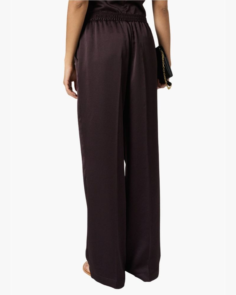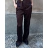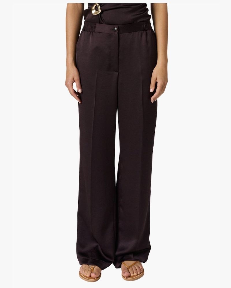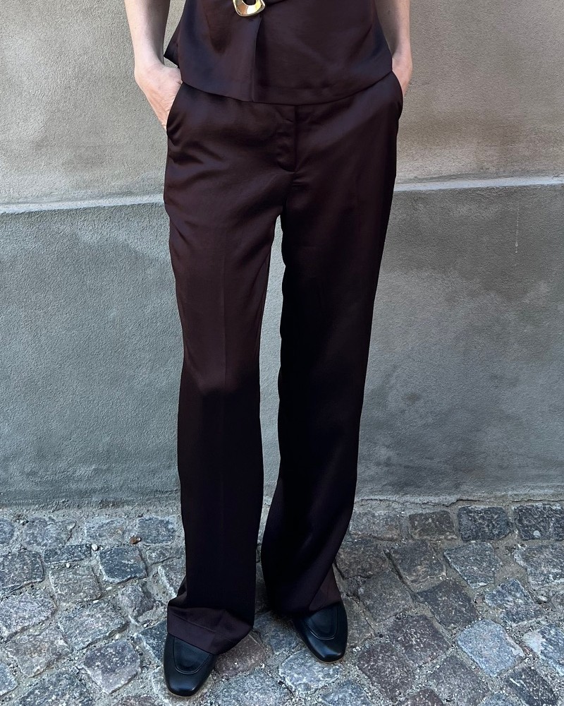 Amelya bukser i mørkebrun blød satin polyester. Bukserne har læg ned langs benet, skrålommer og knaplukning med skjult lynlås foran. De har elastisk linning bagpå for en perfekt pasform og ekstra komfort. Med lange lige ben med fuld længde.