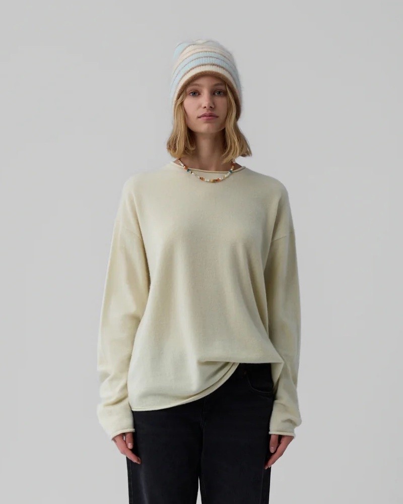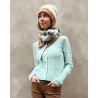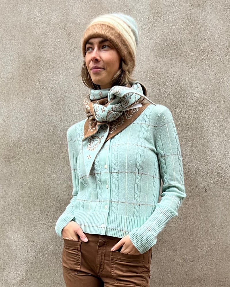 Grizzly vendbar hue i ren og blød børstet cashmere. På den ene side har den fint stribet mønster i mint, cognac og lysegul, og på den anden side er den ensfarvet cognac.