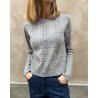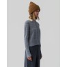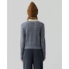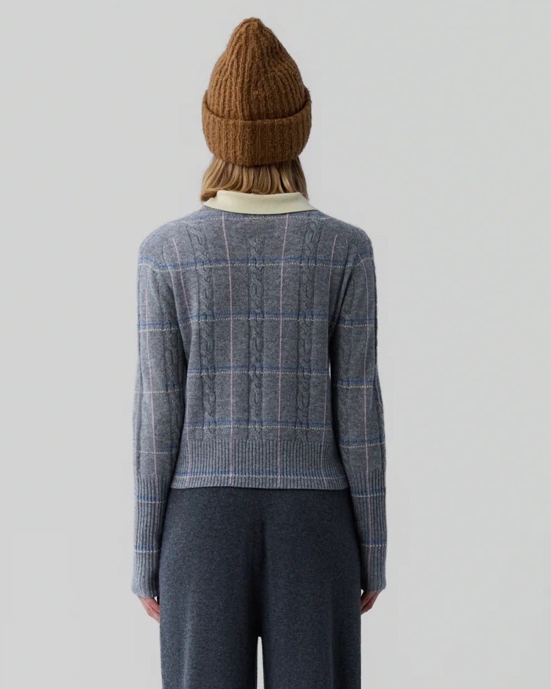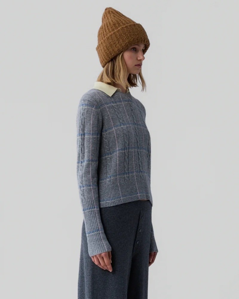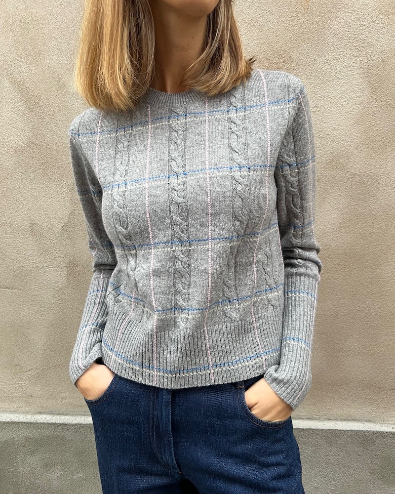 Langærmet lysegrå cashmere strik med jacquard kabelstrikket og ternet mønster. Shrunken crew har ribstrikket rund hals, lange smalle ærmer med ekstra bred ribkant og samme brede rib for neden. Strikken har en tætsiddende pasform, og er en anelse kort i modellen, dog uden at være cropped. Kvaliteten er premium cashmere kvalitet fra Mongoliet.