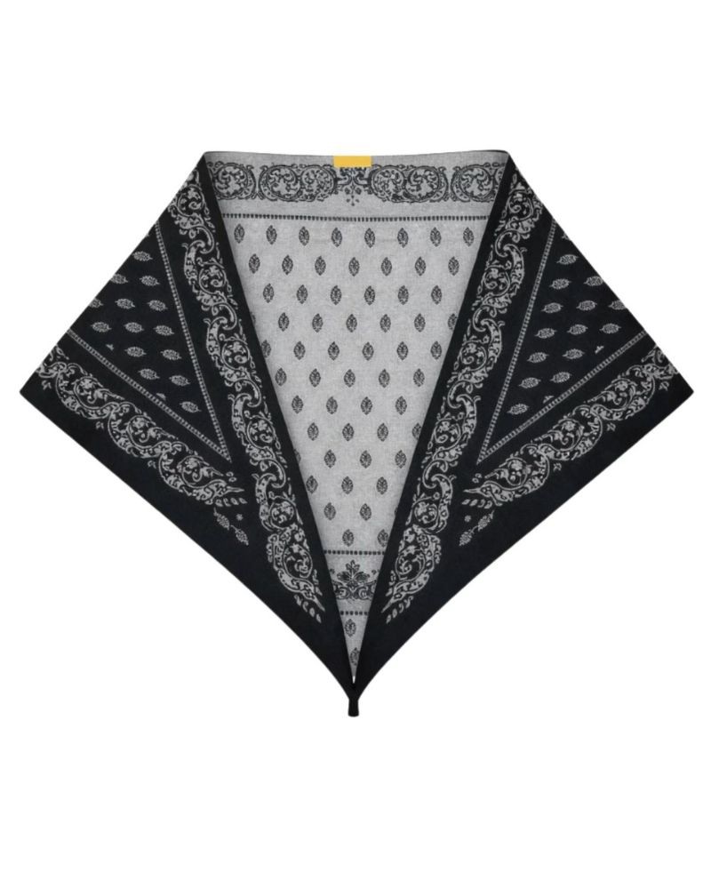 Trekantet tørklæde i vendbart design med gråt og sort paisley mønster. Tørklædet er strikket i 100% ren og blød eksklusiv cashmere fra Mongoliet.