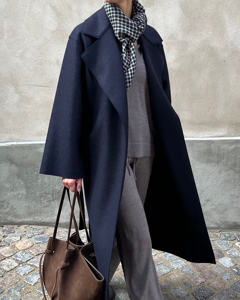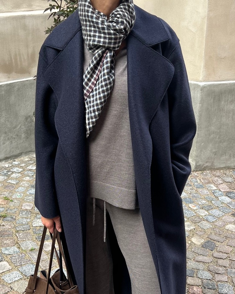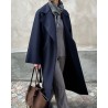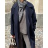 Frakke i mørk navy i den klassiske Harris Wharf kvalitet i felted uld, hvor ulden er kogt og presset. Resultatet er en blød, varm og virkelig holdbar uld, som både giver ekstra varme og forlænget holdbarhed. Frakken har revers, dropped shoulders og bælte, som kan tages helt af. Den er uforet, har sidelommer og udvendige sømme, hvilket giver et casual og sofistikeret look.
