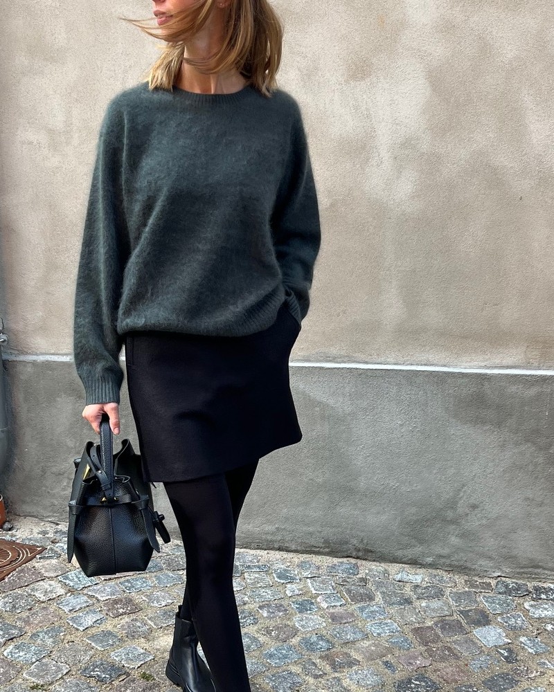 Klassisk og enkel kort nederdel i sort, let presset uld - en signatur kvalitet fra Harris Wharf London. Nederdelen er uforet, har fast linning, sidelommer og lukkes med lynlås midt bag.