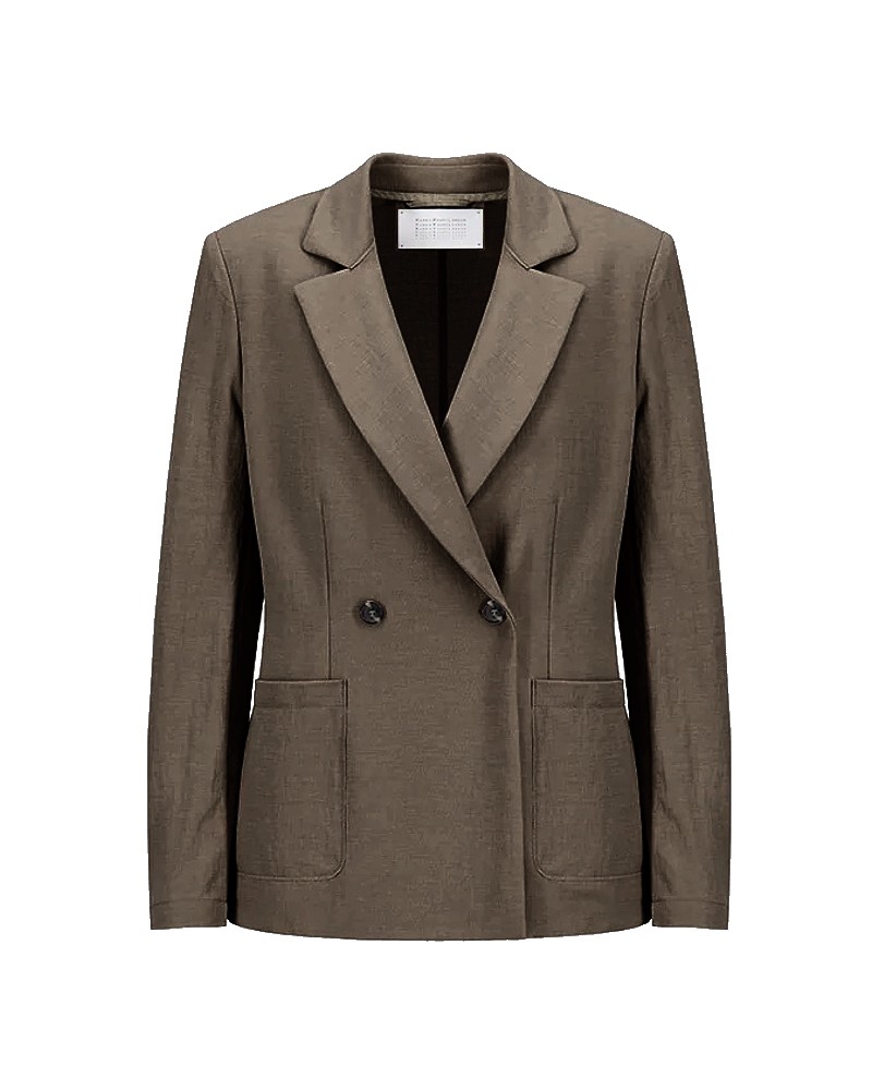 Blazer i blød vævet rayon viskose kvalitet i mørk taupe nuance. Blazeren er dobbeltradet, uforet og har 2-knaps lukning samt to påsyede lommer foran. Den er let figursyet, har hakrevers og skulderpuder. Kan styles med de matchende wide leg bukser i samme farve og kvalitet.