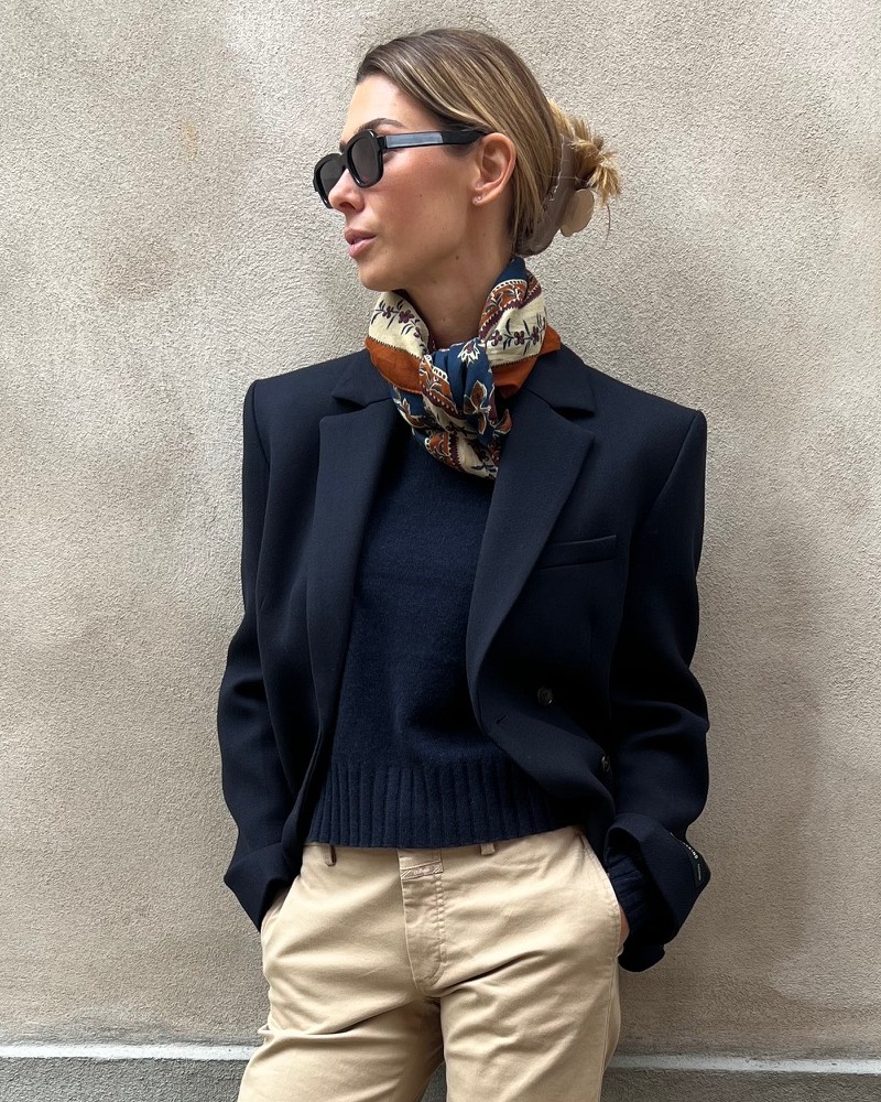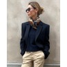 Sailor blazer i marineblå uldblanding. Sailor blazer har en tætsiddende pasform med asymmetrisk lukning foran og indsnit i taljen for en skræddersyet, feminin silhuet.