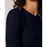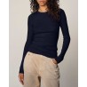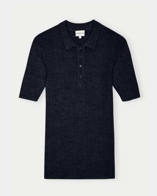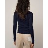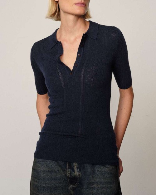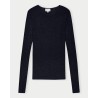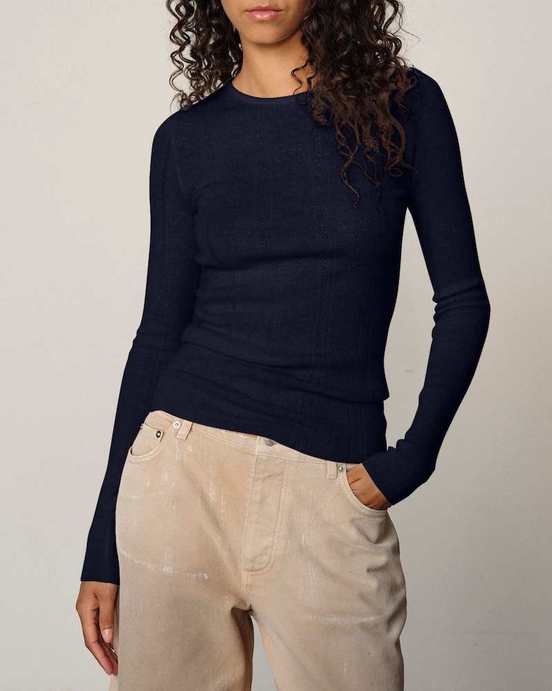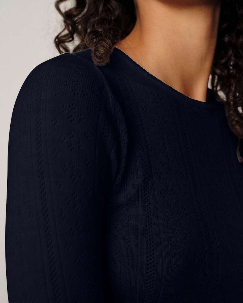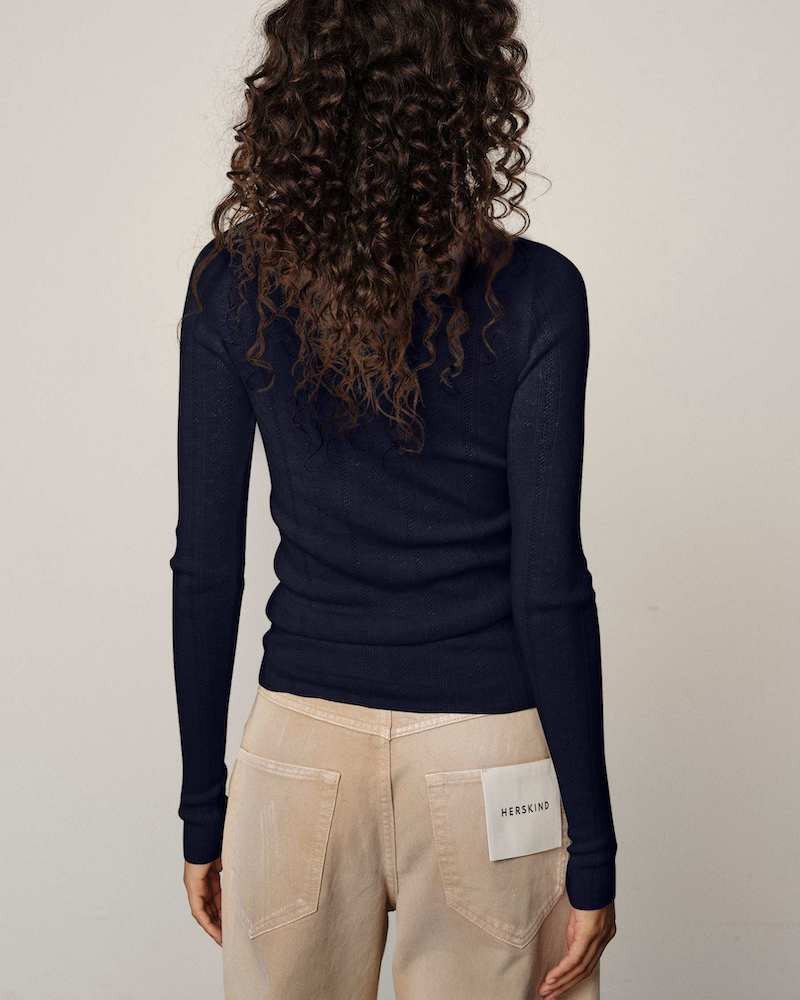 Camb fin strik i navy blå merinould med delikat pointelle mønster. Camb har rund halsudskæring, lange ærmer og en tætsiddende pasform. Blød mod huden med åndbar varme til brug året rundt.