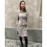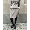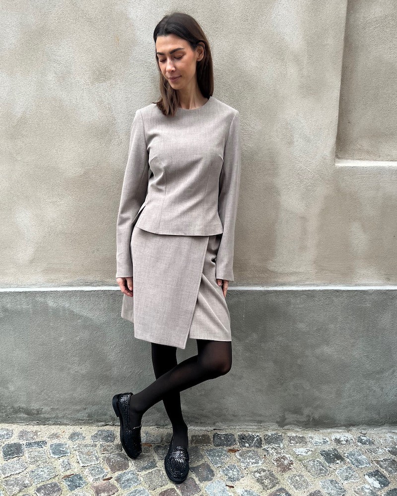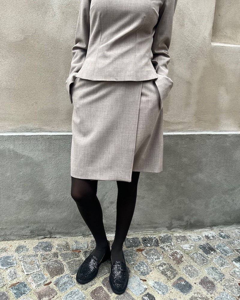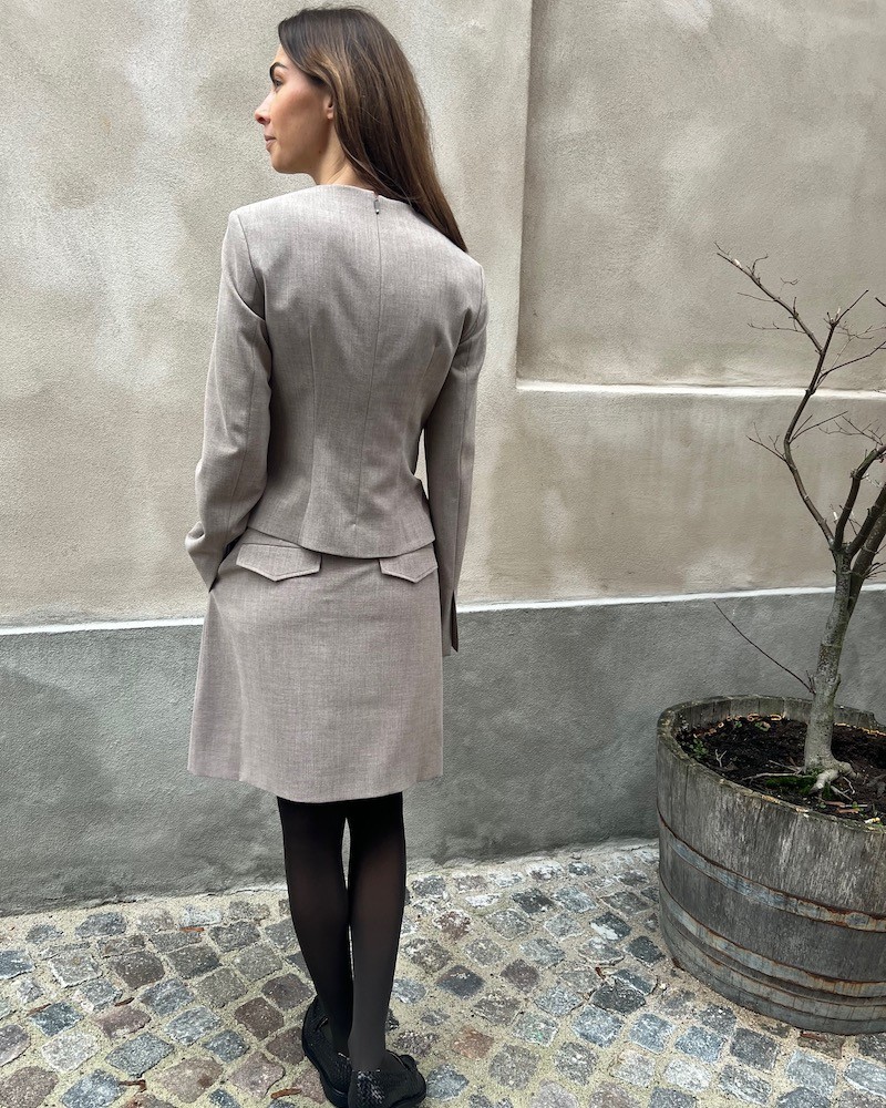 Dita kort nederdel i beige melange med skræddersyet finish. Nederdelen har fast linning med bælte-loops, skrålommer og slå-om knaplukning. Kan styles med den matchende Laila fitted blazer i samme kvalitet.