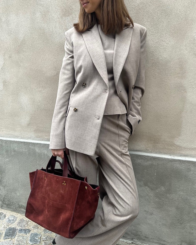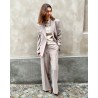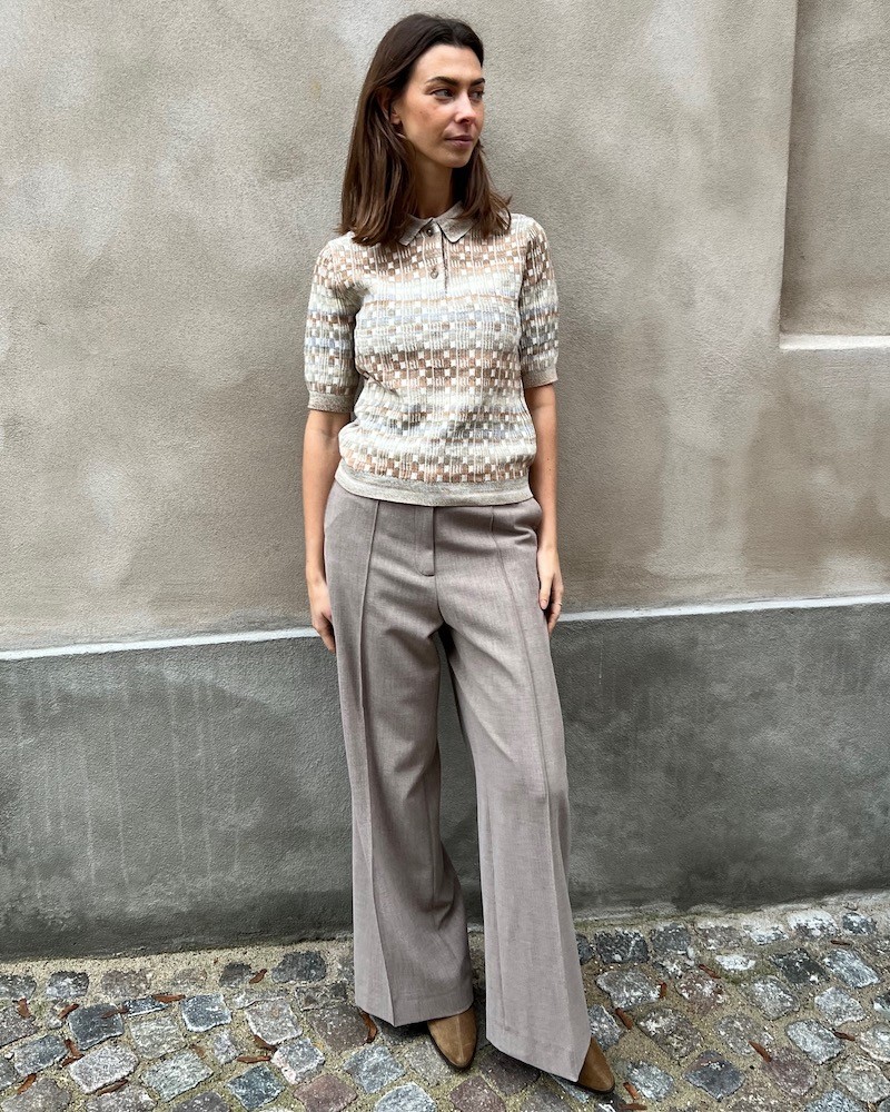 Kimberly bukser i beige melange med skræddersyet finish. Bukserne har mellemhøje talj, og er skåret i en afslappet slihuet med vidde ben og pressefolder og sidelommer. Blød og raffineret hverdagskvalitet, som er nem at style. De har en rummelig pasform, og vi anbefaler derfor at gå en størrelse ned i denne model.