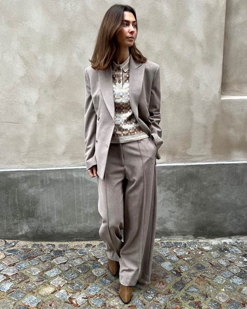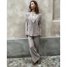 Laila fitted blazer jakke i beige melange med skræddersyet finish. Blazeren har klassisk revers, og er dobbeltradet. Den har en fitted pasform, med to lommer med klap foran og diskret logo på det ene ærme. Kan styles med Dita nederdel eller Kimberly bukser i samme farve og kvalitet.
