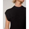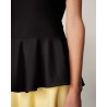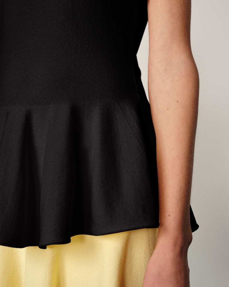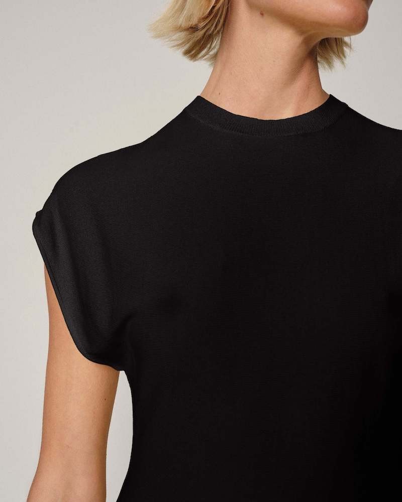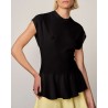 Sort fin strik top fremstillet af let og blød viskose og nylon. Sean har en ren og tætsiddende silhuet, der falder blødt ind i taljen og ind i en peplumkant. Den har helt korte minimalistiske ærmer, der lige dækker skuldrene og en høj, raffineret og elegant rund halsudskæring.