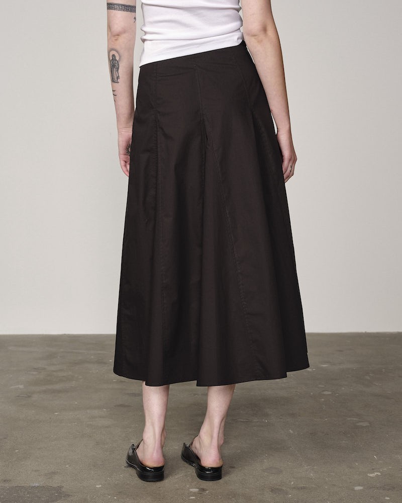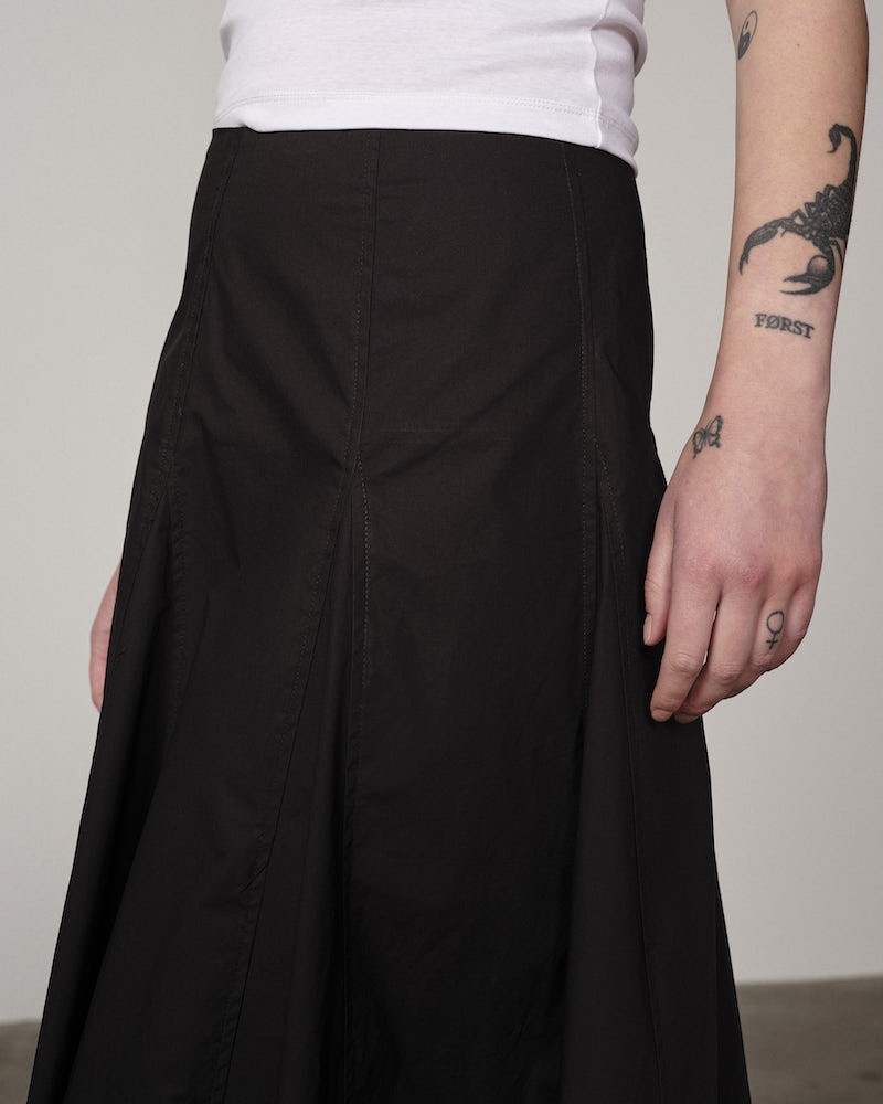 Greta nederdel i sort bomuld med flatterende volumen og mellemlangt snit. Nederdelen har fast linning og skjult lynlås lukning midt bag. Designet med et minimaltisk og elegant udtryk med midi længde.
