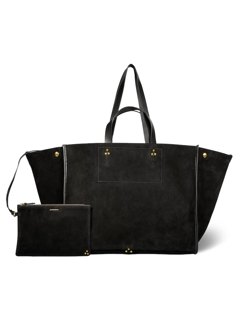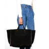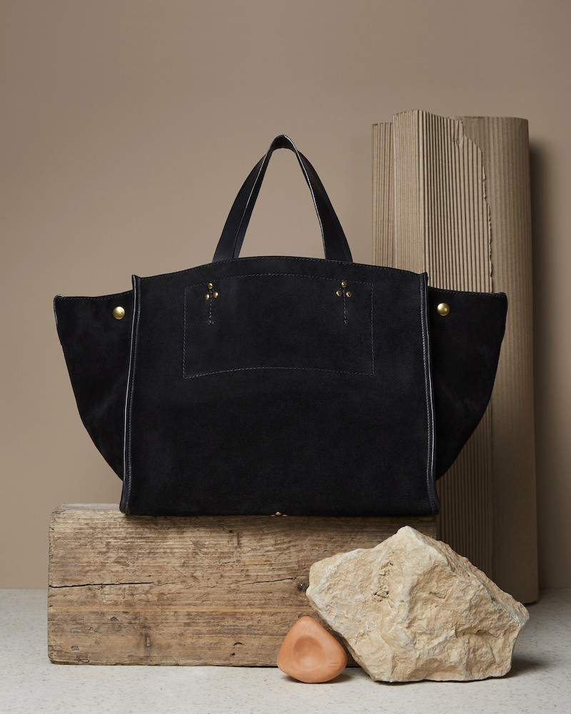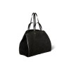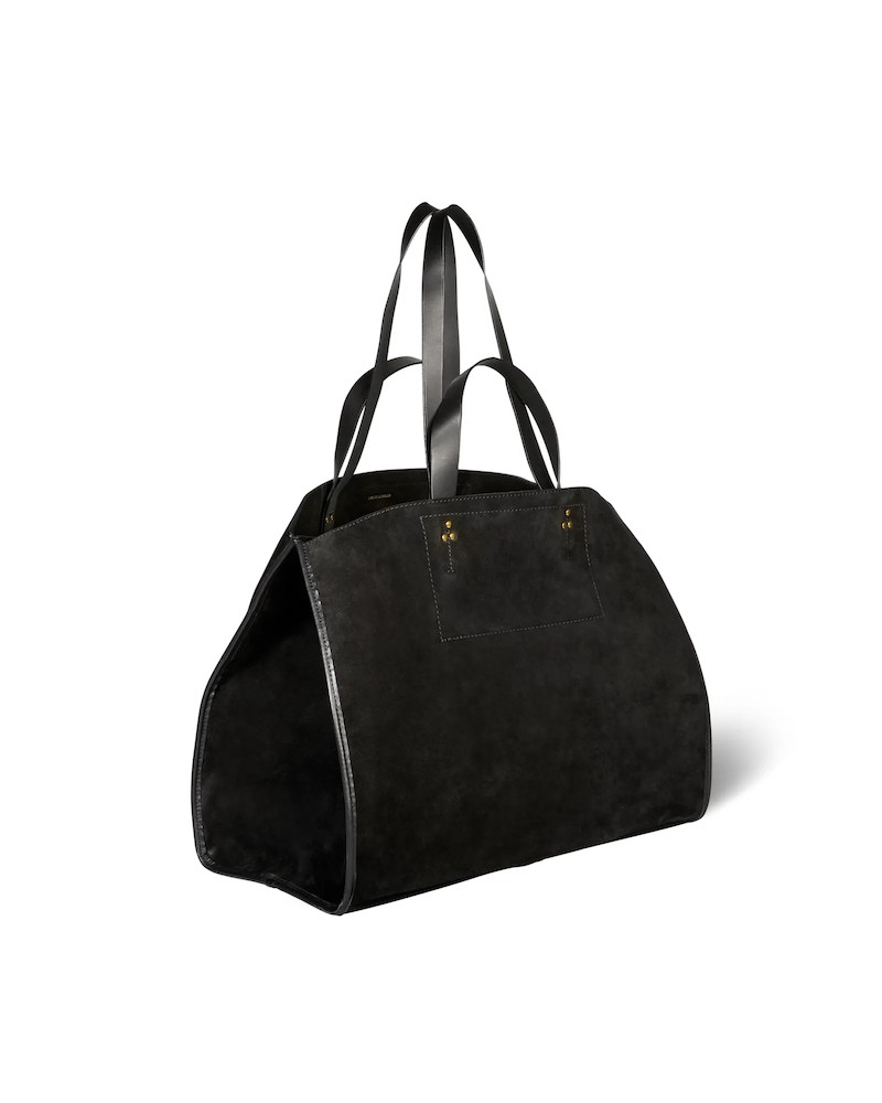 Maxi tote i størrelse large i sort ruskind med kanter og håndtag i sort læder. Leon har trykknapper i siderne så volumen kan øges, indvendig har den et stort rum, og der medfølger lille pouch og nøglesnor med krog, som kan bruges til nøgler mm. Med to sæt stropper så den kan bæres både i hånden og over skulderen.