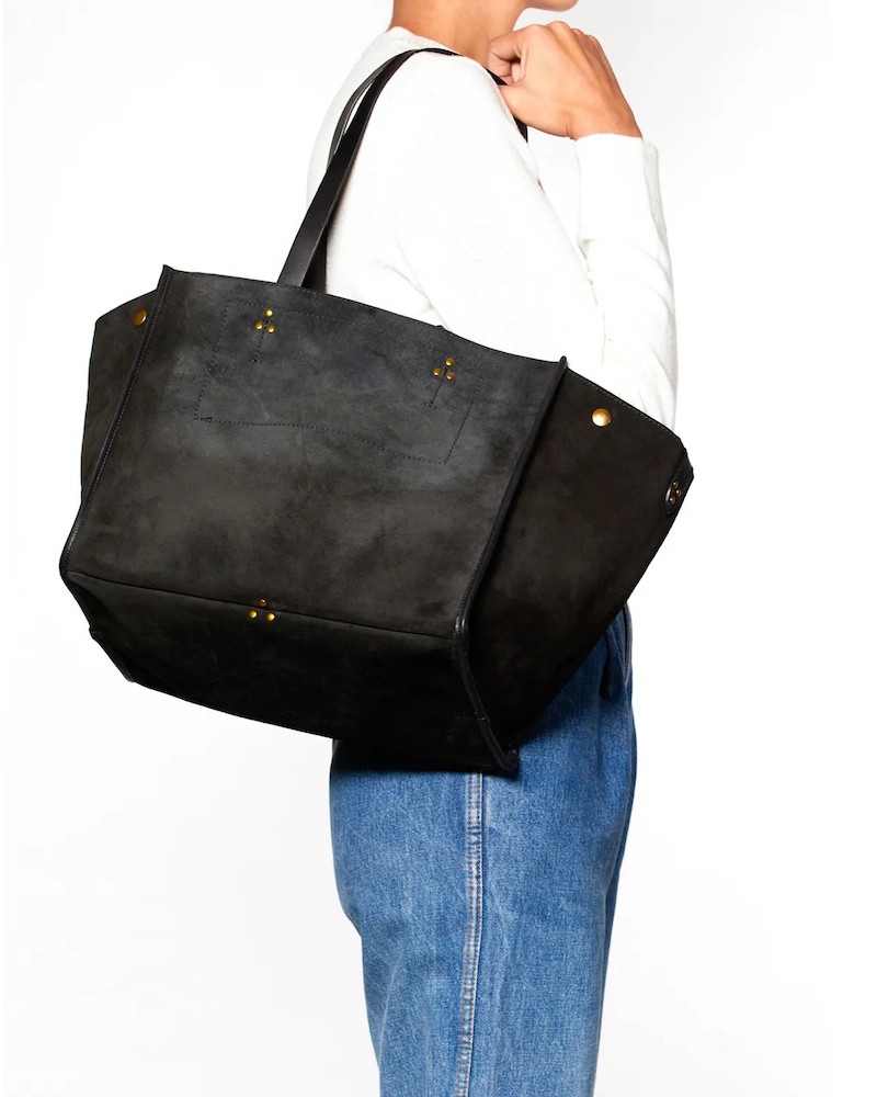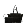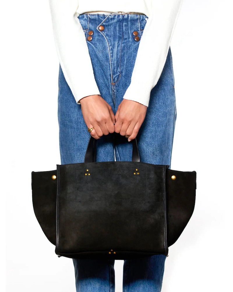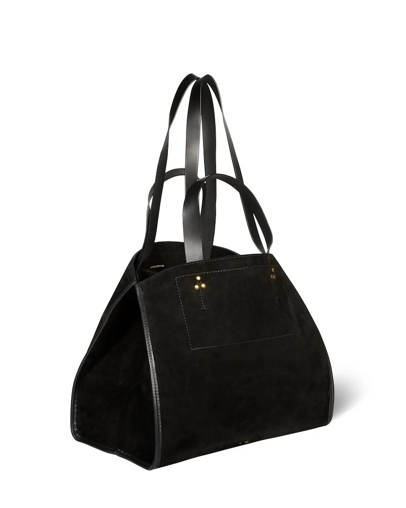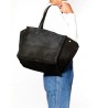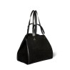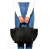Tote i størrelse medium i sort ruskind med kanter og håndtag i sort læder. Leon har trykknapper i siderne så volumen kan øges, indvendig har den et stort rum, og der medfølger lille pouch og snor med krog, som kan bruges til nøgler mm. Med to sæt stropper så den kan bæres både i hånden og over skulderen.