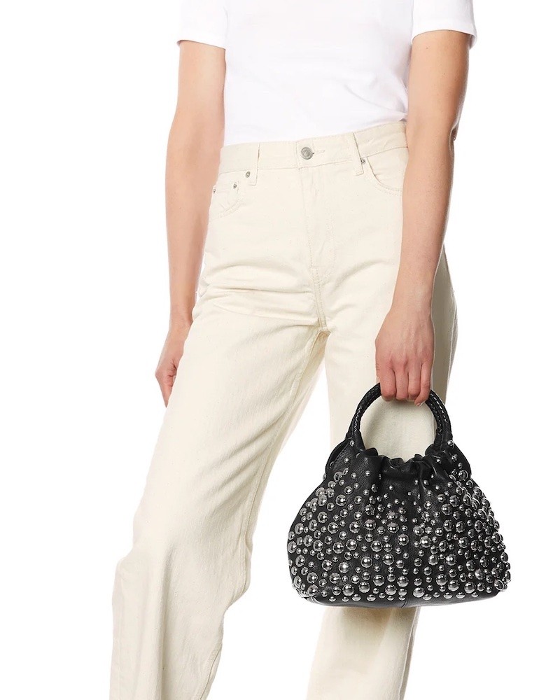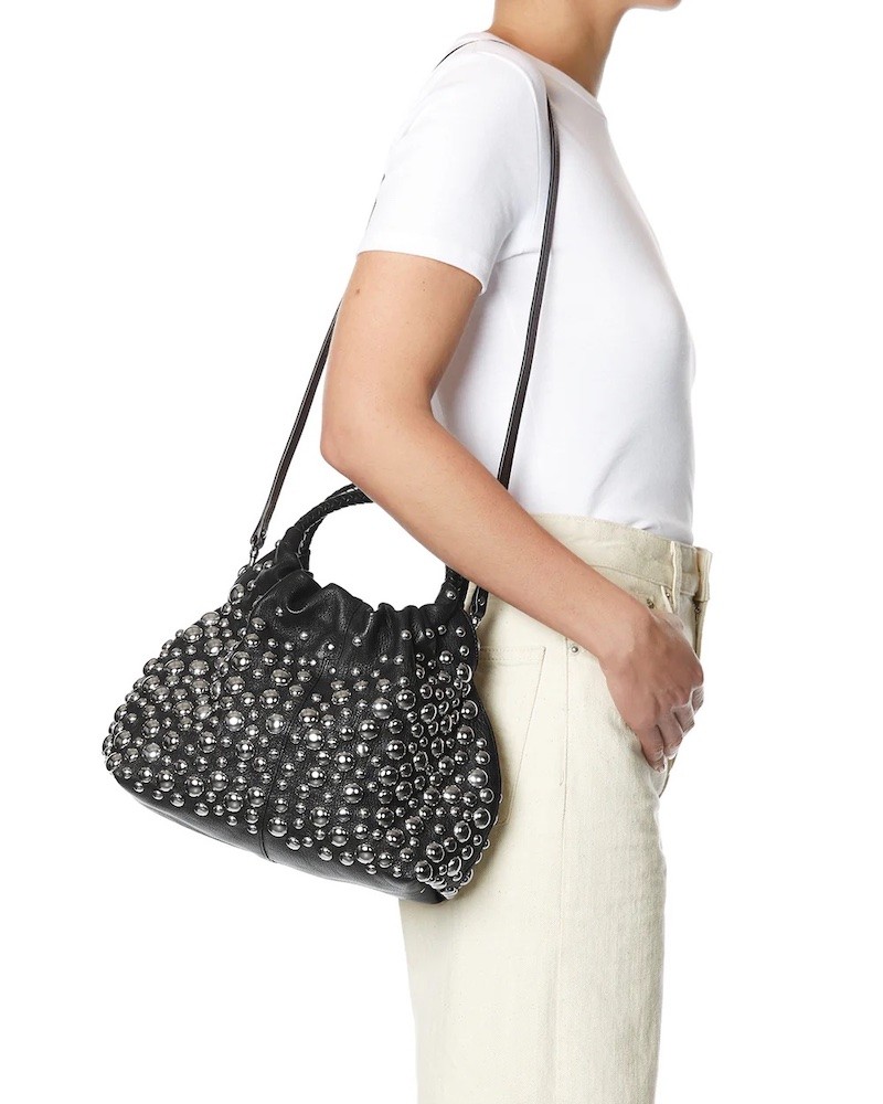 Gordi hobo taske i størrelse M fra den nye Jerome Dreyfuss Capsule Limited Edition Collection. Denne i sort grained skind med runde hanke af flettet skind og med klare sølvfarvede all-over studs. Gordi kan bæres både i hånden og over skulderen. Den har en aftagelig rem på 95 cm. Indvendigt har den et stort rum, samt en nøglesnor.