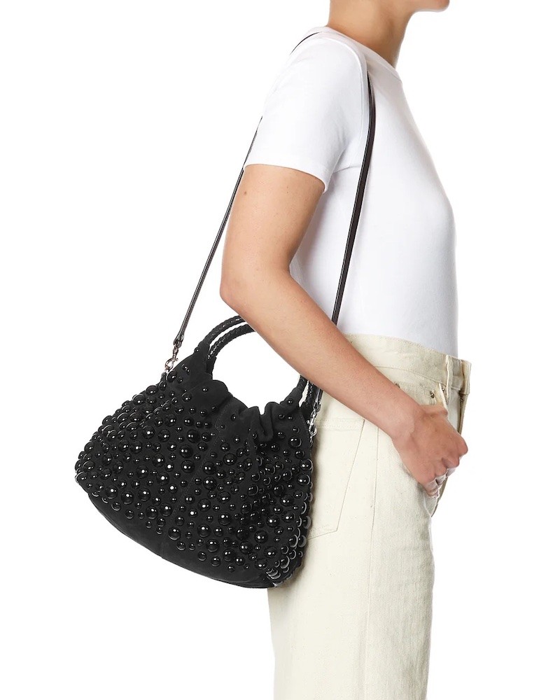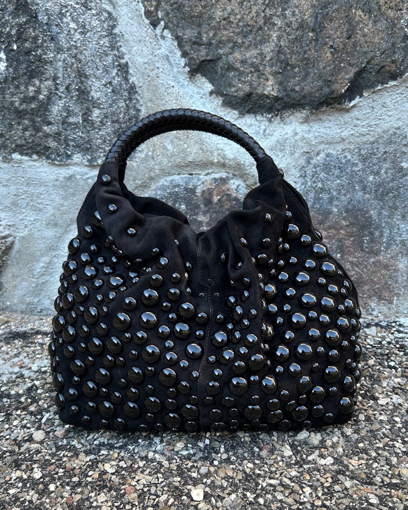 Gordi hobo taske i størrelse M fra den nye Jerome Dreyfuss Capsule Limited Edition Collection. Denne i sort ruskind med runde hanke af flettet skind og med elegante sorte all-over studs. Gordi kan bæres både i hånden og over skulderen. Den har en aftagelig rem på 95 cm. Indvendigt har den et stort rum, samt en nøglesnor.