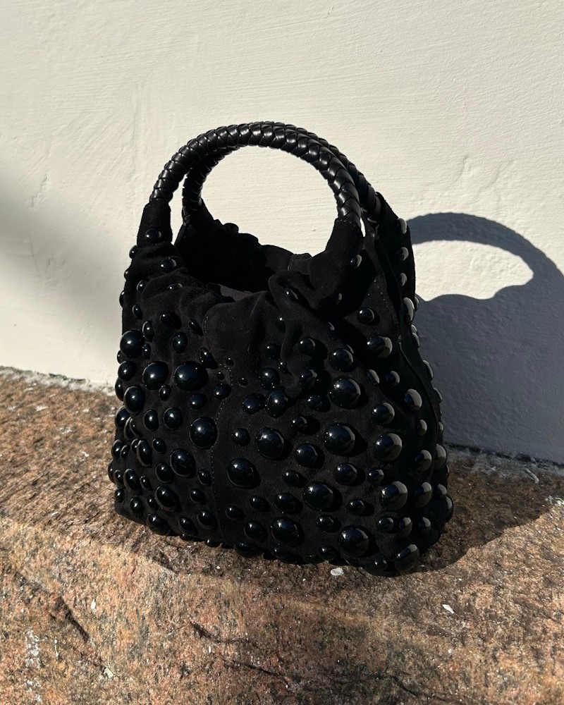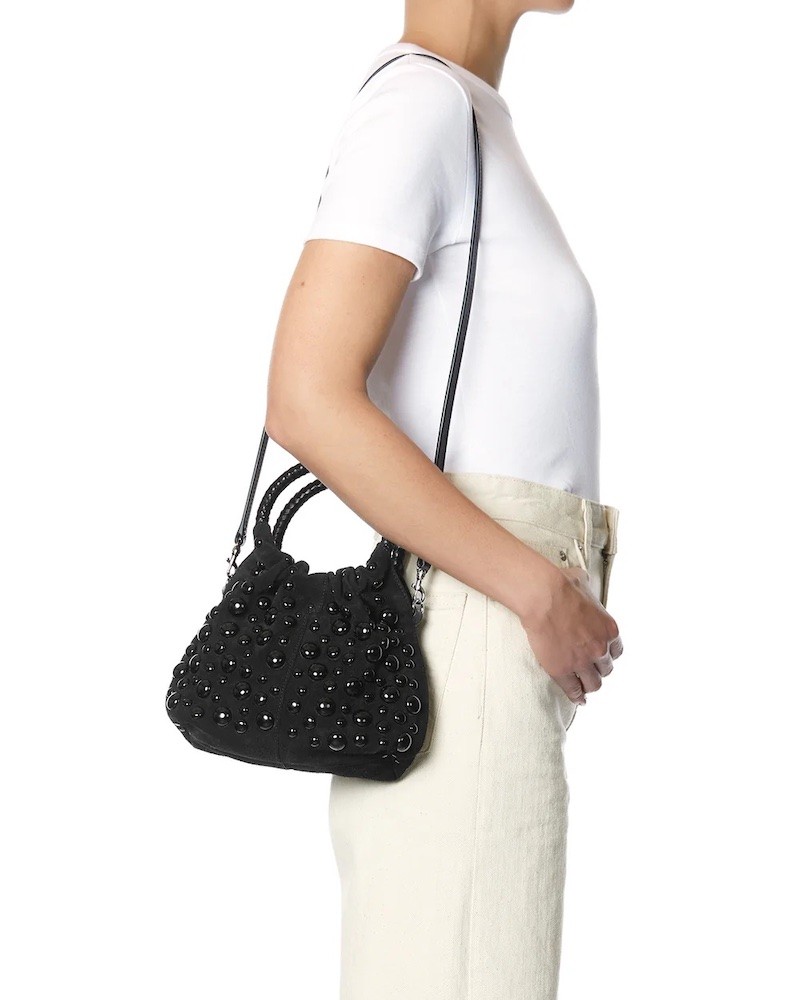 Gordi hobo taske i størrelse S fra den nye Jerome Dreyfuss Capsule Limited Edition Collection. Denne i sort ruskind med runde hanke af flettet skind og med elegante sorte all-over studs. Gordi kan bæres både i hånden og over skulderen. Den har en aftagelig rem på 95 cm. Indvendigt har den et stort rum, samt en nøglesnor.