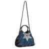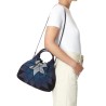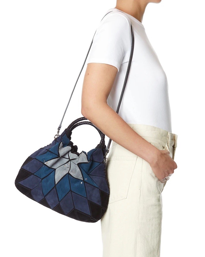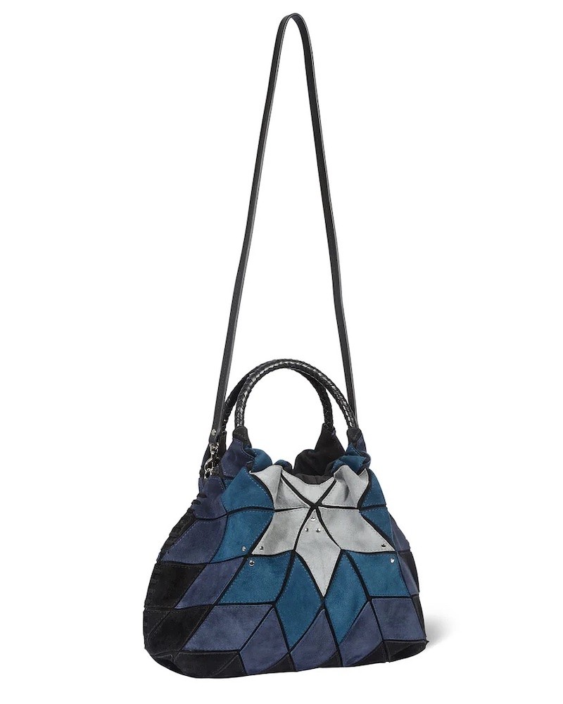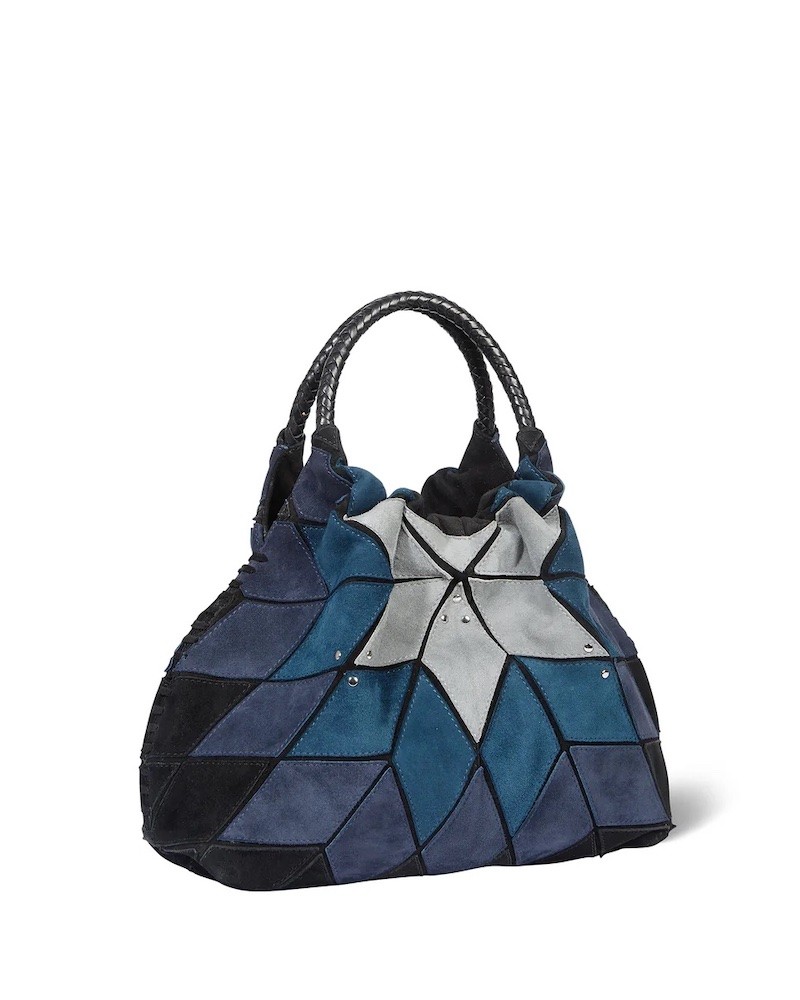Godt hobo taske i størrelse M i blå og sort ruskind i smukt patchwork mønster og runde sorte hanke af flettet glat skind. Gordi kan bæres både i hånden og over skulderen. Den har en aftagelig rem på 95 cm. Indvendigt har tasken et stort rum, samt en nøglesnor. Den har en åben top, og de tre ikoniske studs dekorativt foroven.