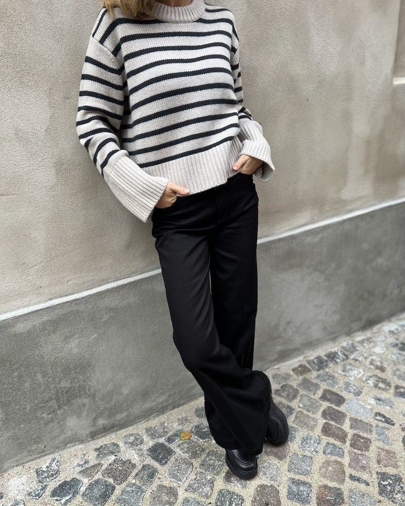 Sony strik sweater i ren, eksklusiv cashmere fra Lisa Yang. Denne i stribet kombination af sandfarvet og sort. Sony har en rund halsudskæring med tæt sandfarvet rib, og lange ærmer med vidde og samme sandfarvede brede rib i ærmekanten og for neden.