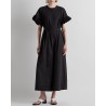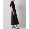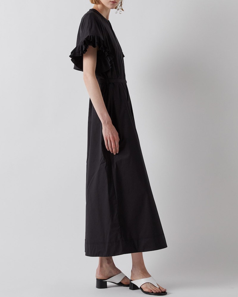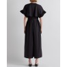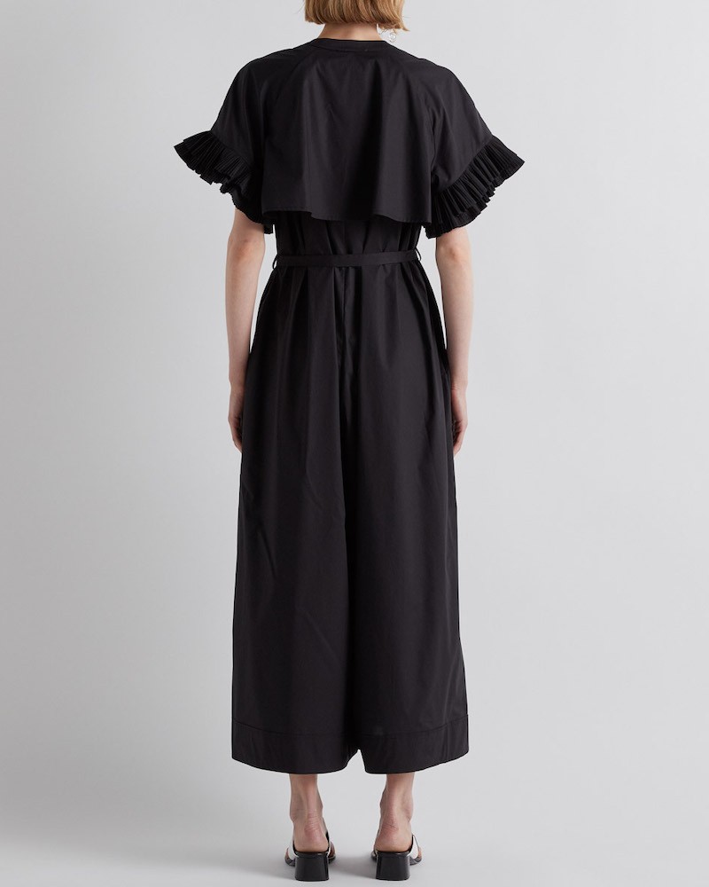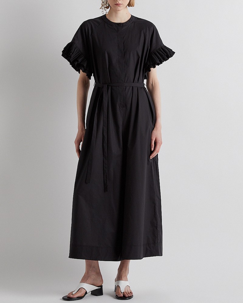 Elegant jumpsuit i sort crispy bomulds poplin. Buksedragten har rund hals, er gennemknappet foran, og har et løst, voluminøst snit med bindebælte. Den har korte ærmer med skulpturel flæsekant, og en cropped benlængde med så meget vidde, at man skal se godt efter for at se, at det ikke er en kjole. Bag på har den et løst slag som falder elegant ud fra ryggen og giver ekstra elegance. Med lommer i siderne, og aftageligt bindebælte.
