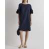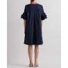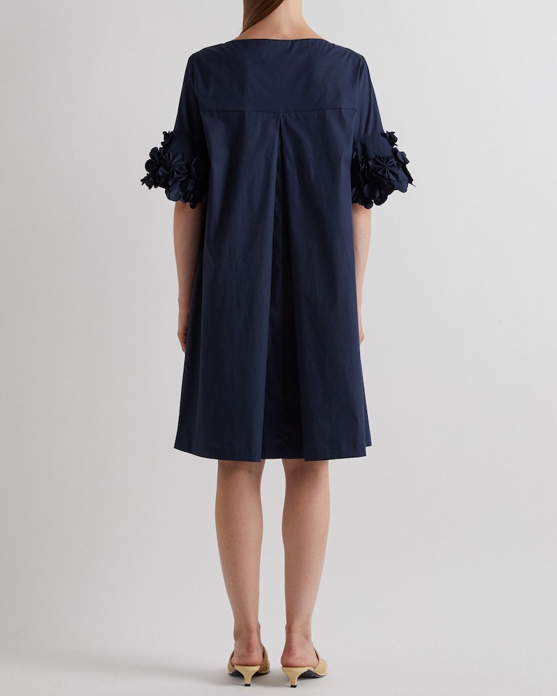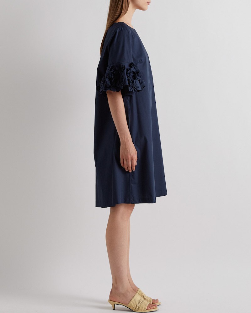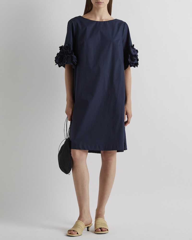 Kjole i mørkeblå crispy bomulds poplin med feminine blomsterapplikationer på ærmerne. Kjolen har et enkelt og minimalistisk udtryk med rund halsudskæring og korte raglanærmer med dekorative tone i tone applikationer.