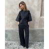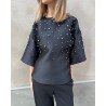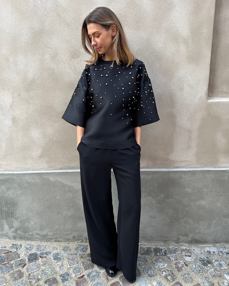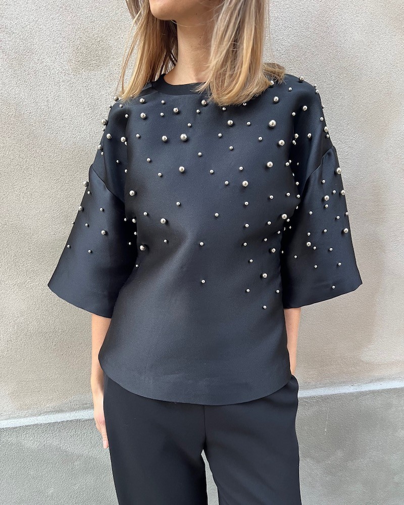 Ekstravagant Teagan Aterlier bluse i sort tech og silke kvalitet. Blusen har rund hals med smal ribkant, og er dekoreret med delikate sølvfarvede studs. Den har albuelange ærmer med sænkede skuldre, er let figursyet og har skjult lynlås i siden.