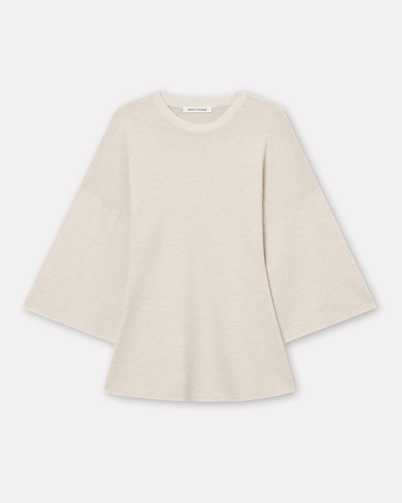 Elegant ecru strik bluse i blød og fin merinould. Kama har rund halsudskæring, og feminine albuelange ærmer med vidde. Den er figursyet, og har en tætsiddende pasform, især omkring taljen uden at være slim fit.